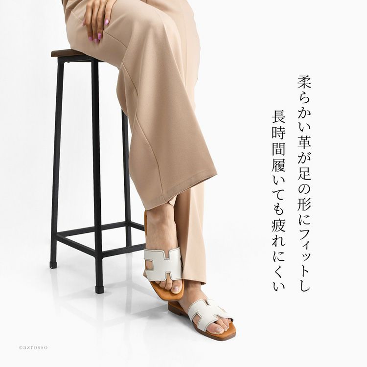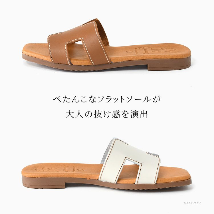 カーフレザーの洗練感とぺたんこヒールの抜け感が夏のおしゃれを格上げする、スペイン製ミュールサンダル。革が柔らかいから歩きやすく、クッション性の高い低反発フラットソールで疲れにくいレディースサンダル スペイン製 フラットサンダル 本革 レディース ミュール カジュアル オーマイサンダルズ クッション性 疲れにくい ぺたんこ 歩きやすい