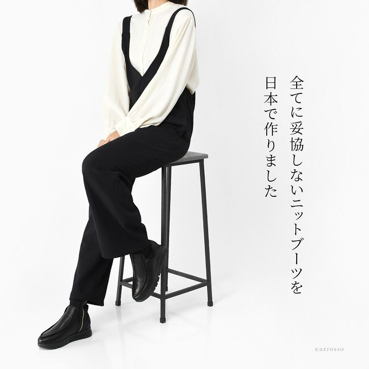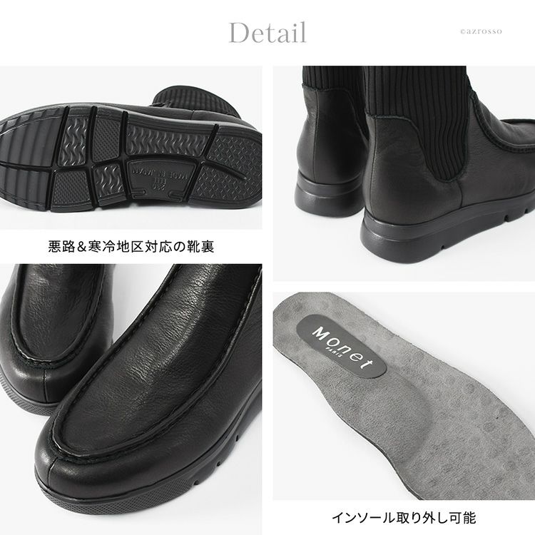見た目は細身でも足あたりは驚くほど柔らかいモネ(monet)のニットブーツ。長時間歩いても疲れにくい快適設計。ローヒール&超軽量で疲れにくく、40代・50代の大人女性や外反母趾の方にもおすすめ。 日本製 4E 幅広 軽量 本革ショートブーツ サイドジップ レディース 黒 モネ monet ブランド レディース 痛くない 歩きやすい ニットブーツ