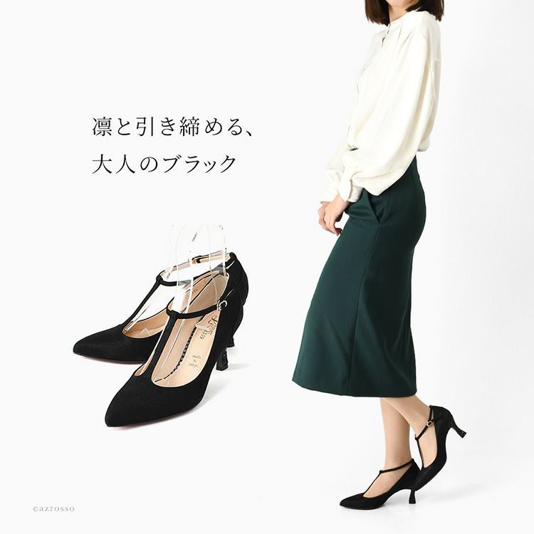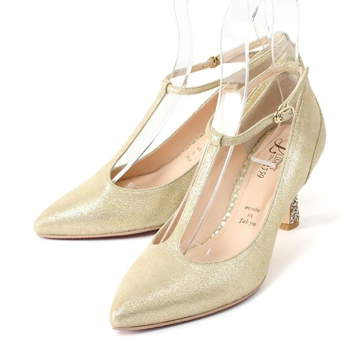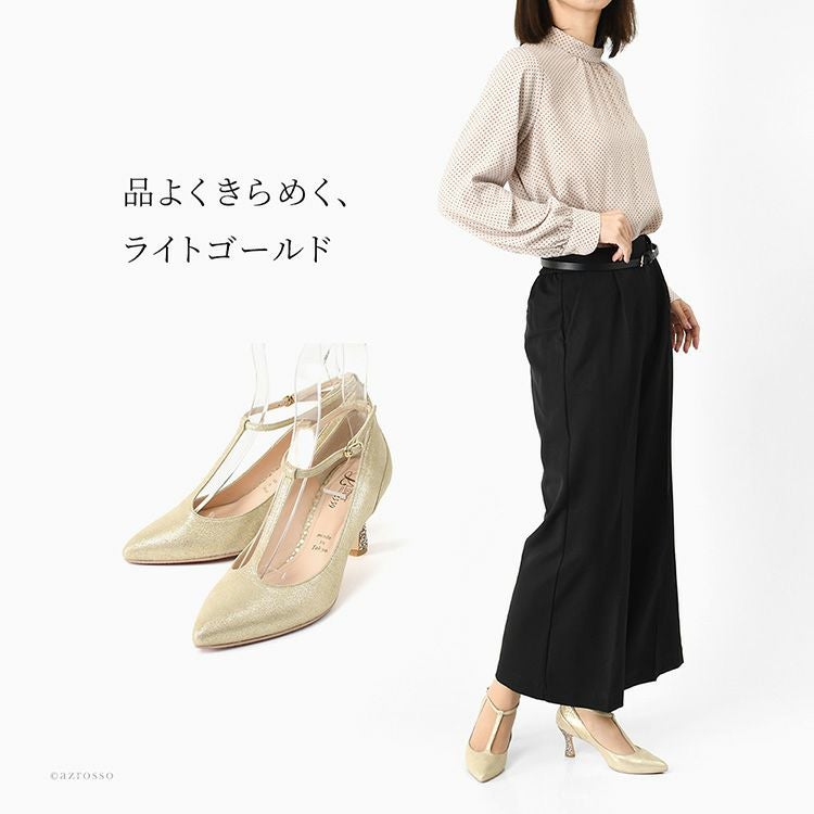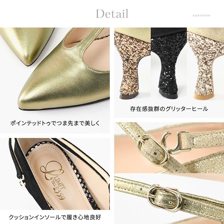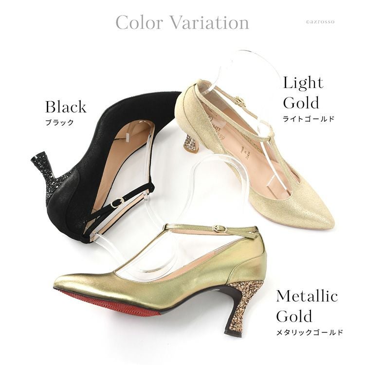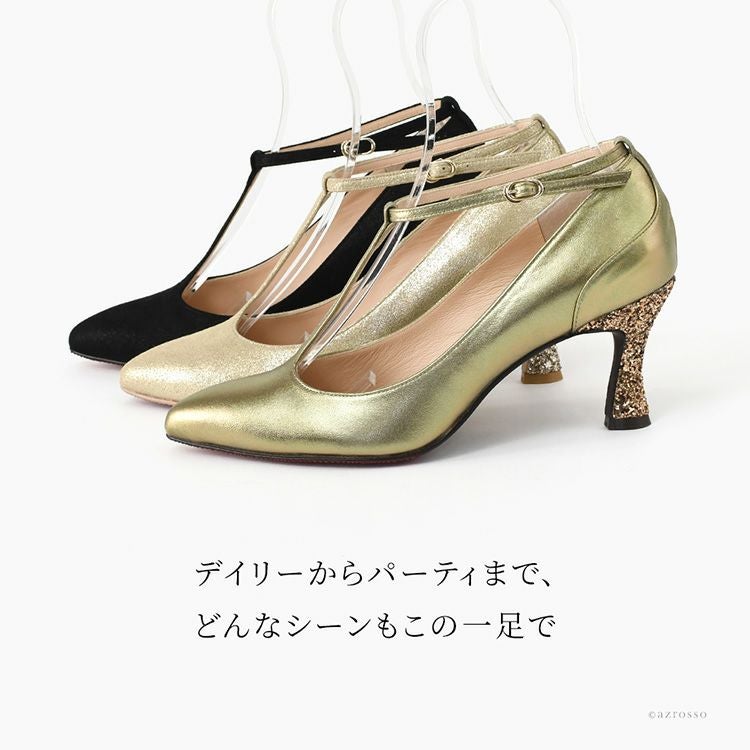 晴雨兼用 本革 ストラップ パンプス 日本製 ハイヒール ポインテッドトゥ 7cm ヒール ブラック メタリック ゴールド レザー グリッター パーティー
