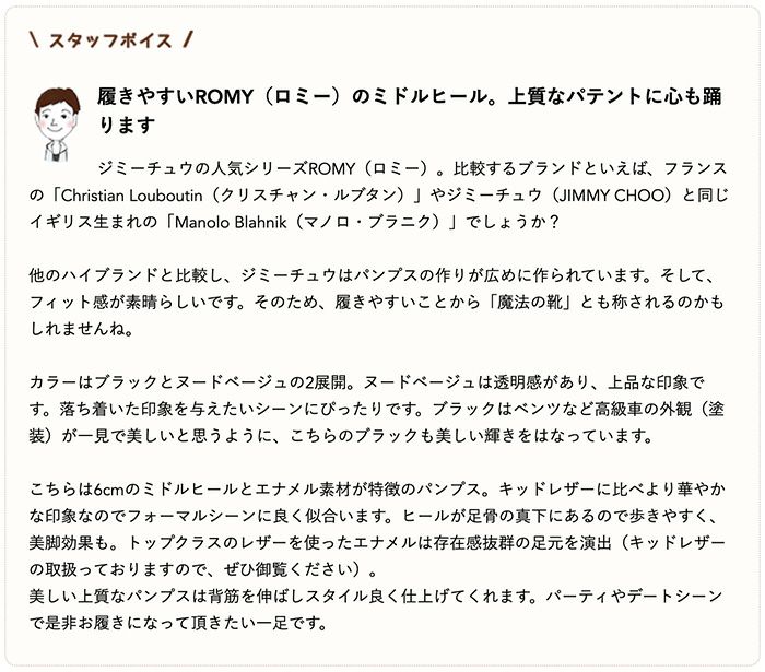 セクシーな印象のロミーですが、ポインテッドもとんがりすぎず、日中でも「やり過ぎ感」のない、知的で上品なデザイン。ジミーチュウのパンプスは細身のヒールでも安定感があり、歩きやすく疲れにくいデザイン。その履きやすさから、「奇跡のフィット感」と絶賛され、魔法の靴とも呼ばれるほど。