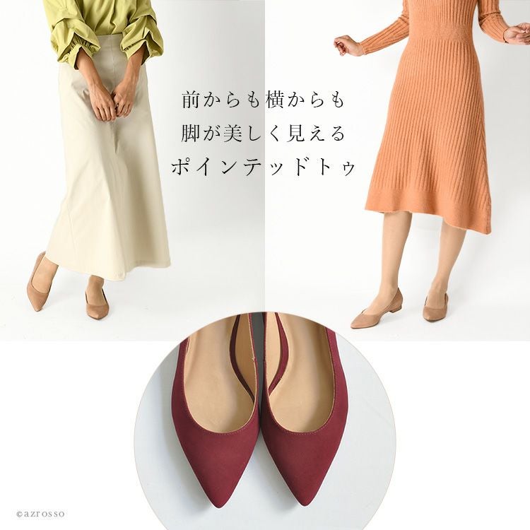 ▼特徴:ローヒール|フラットヒール|ポインテッドトゥ|美脚|甲浅|プレーンパンプス|スエード|本革|衝撃吸収インソール