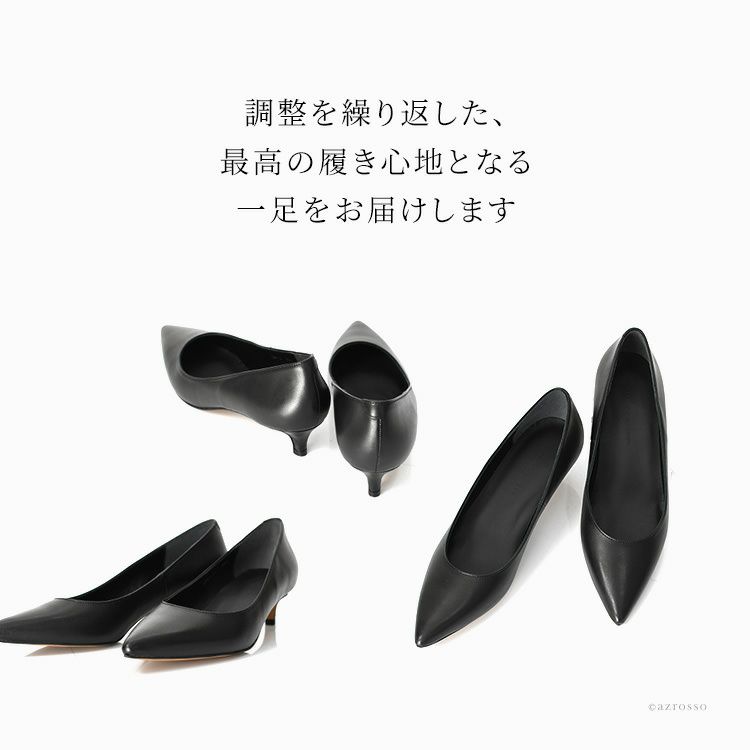 高すぎず低すぎない絶妙な4cmヒールパンプス。どのシーンにも万能な黒のフォーマルパンプスはオフィスや冠婚葬祭まで対応。履きやすく美脚に見える日本製ブランドのポインテッドトゥレザーパンプス ブラック フォーマル パンプス ローヒール 4cm 日本製 本革 レディース ポインテッドトゥ 黒 オフィス 通勤 アトリエ ブルージュ