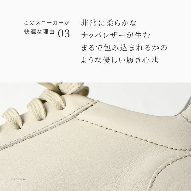 非常に柔らかなナッパレザー(本革)を使用。レザースニーカーでも締め付け感がなく、優しく包み込まれているような柔らかい、痛くない、快適な履き心地を生んでいます。