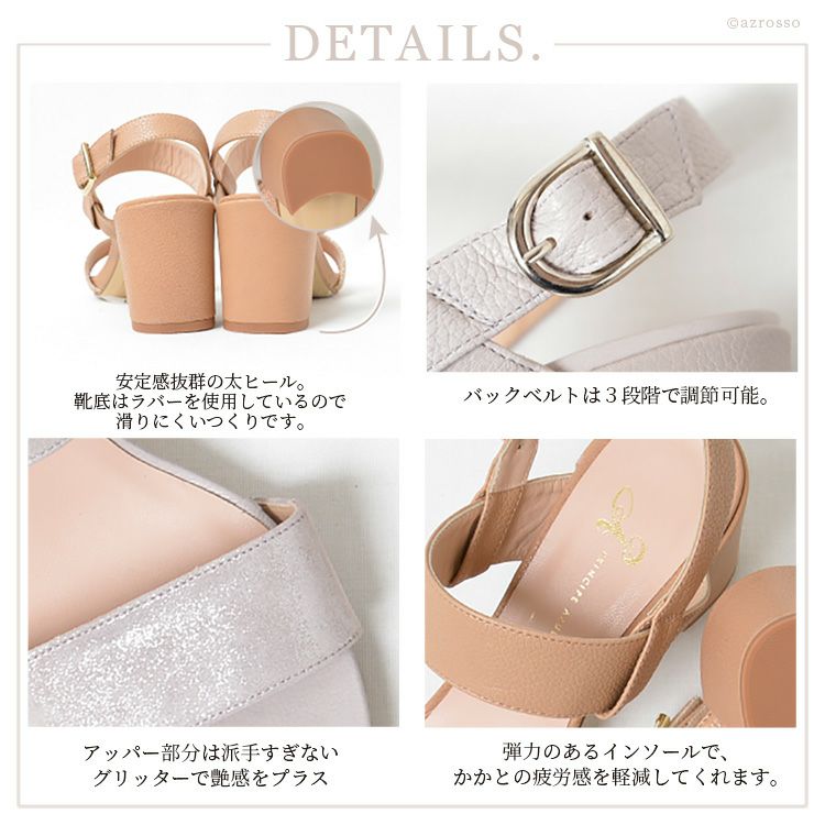 レザー サンダル チャンキーヒール レディース 本革 太 ヒール 7cm かかと ストラップ キャメル ブラウン ベージュ グレージュ グリッター 小さいサイズ 22cm 大きいサイズ 25cm