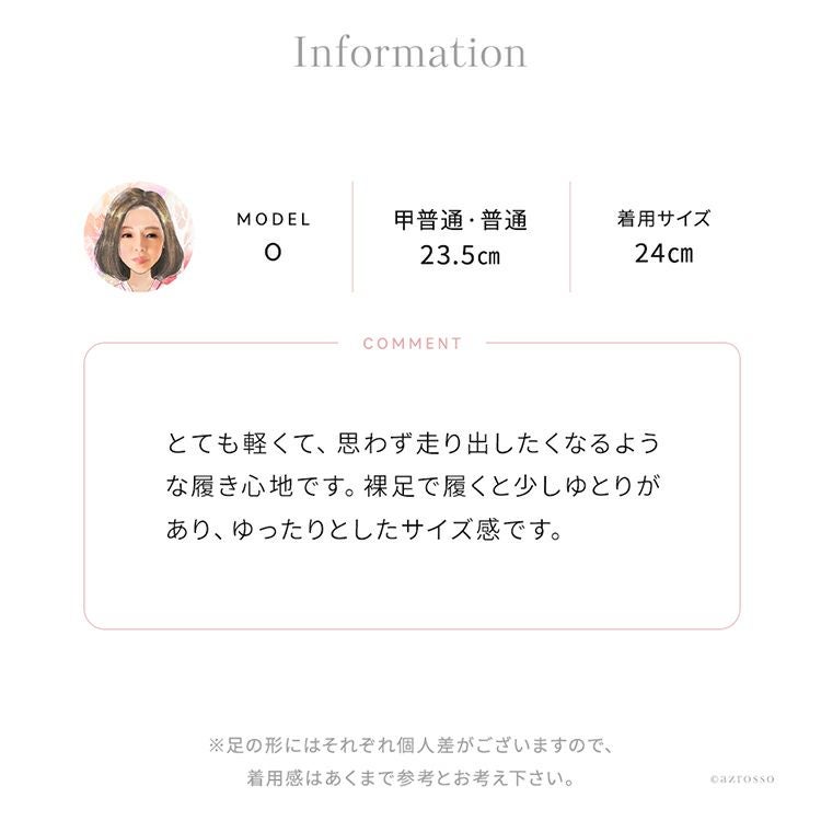 コメント:とても軽くて、思わず走り出したくなるような履き心地です。裸足で履くと少しゆとりがあり、ゆったりとしたサイズ感です。