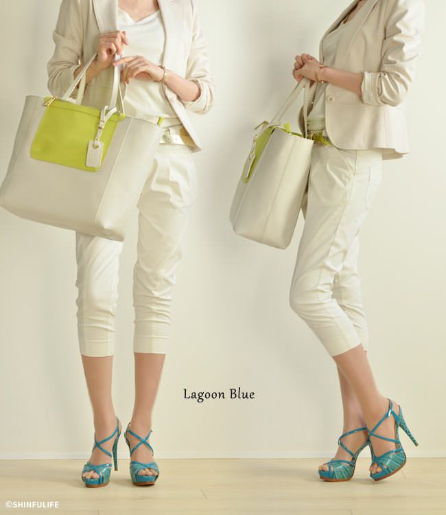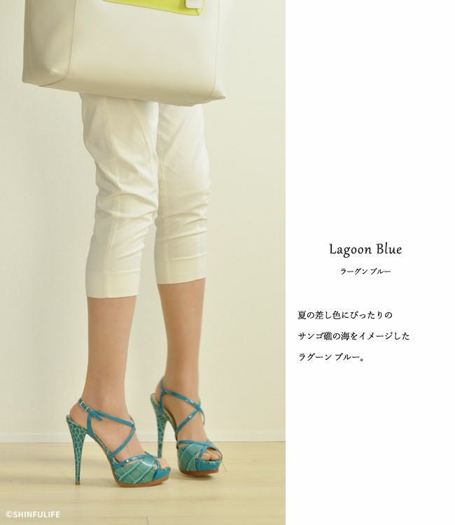 夏に人気の白とエメラルドグリーンのカラーを、更に人気のクロコダイル 型押しレザーの、歩きやすいサンダルは、デートにも、旅行にも、夏のコーデに一足あると便利です。