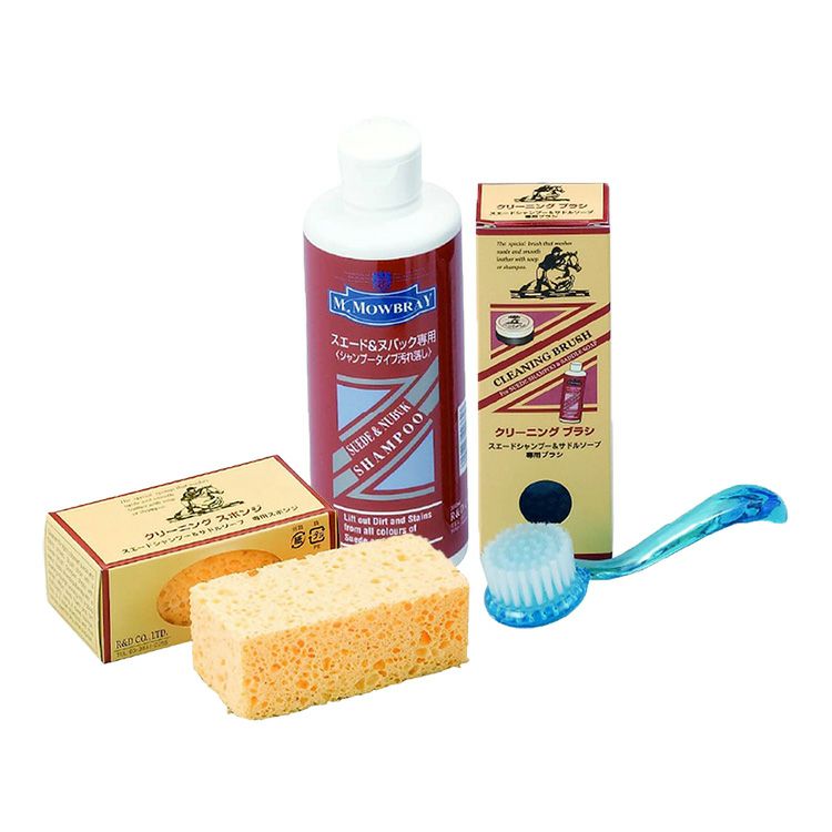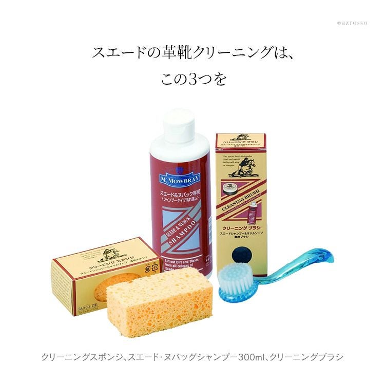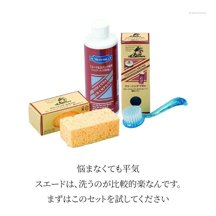 ヨーロッパで人気のシューケアブランド、M.MOWBRAY(モウブレイ)のスエードシャンプーにクリーニングブラシ、クリーニングスポンジをセットに。 モウブレイ スエードシャンプー スエード クリーナー 汚れ落とし ブラシ スポンジ 靴 スエード ヌバック 皮革 革靴 手入れセット M.モゥブレィ M.MOWBRAY お手入れ 革 スムースレザー クリーニング ケア