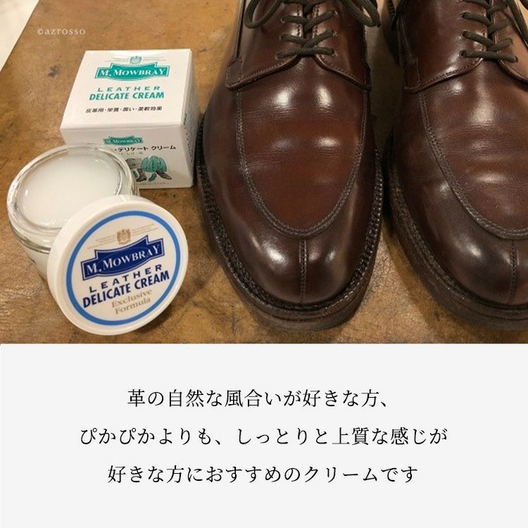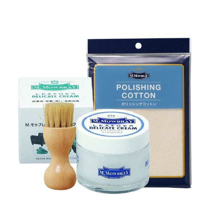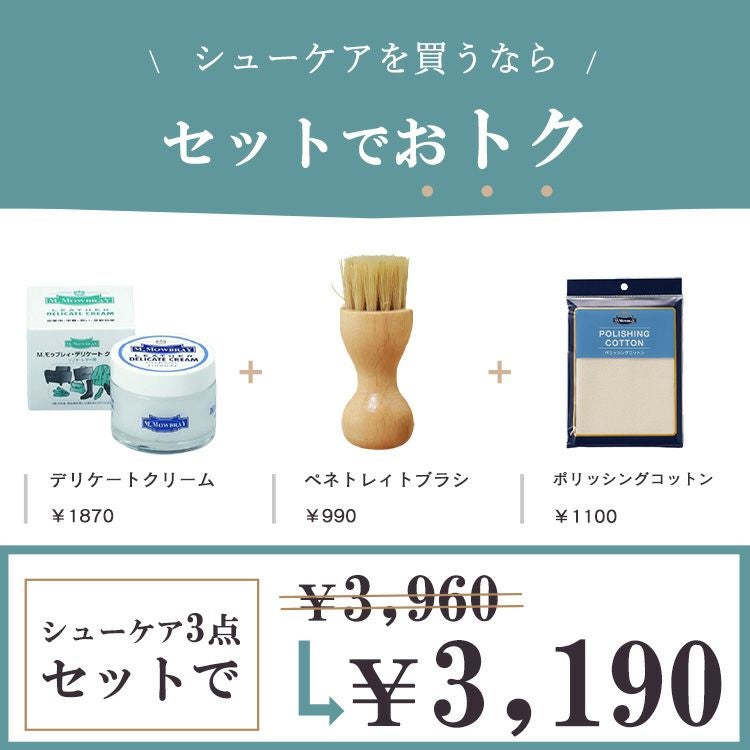 プロユースで評価が高かったケア用品を一般商品化し、さらに日本のファクトリー にて独自製法で開発した商品をラインナップに加えるなど、 品質、伝統、革新をおこなうシューケアブランドとして、M.モウブレイブランドの シューケアプロダクツは日々進化し続けています。