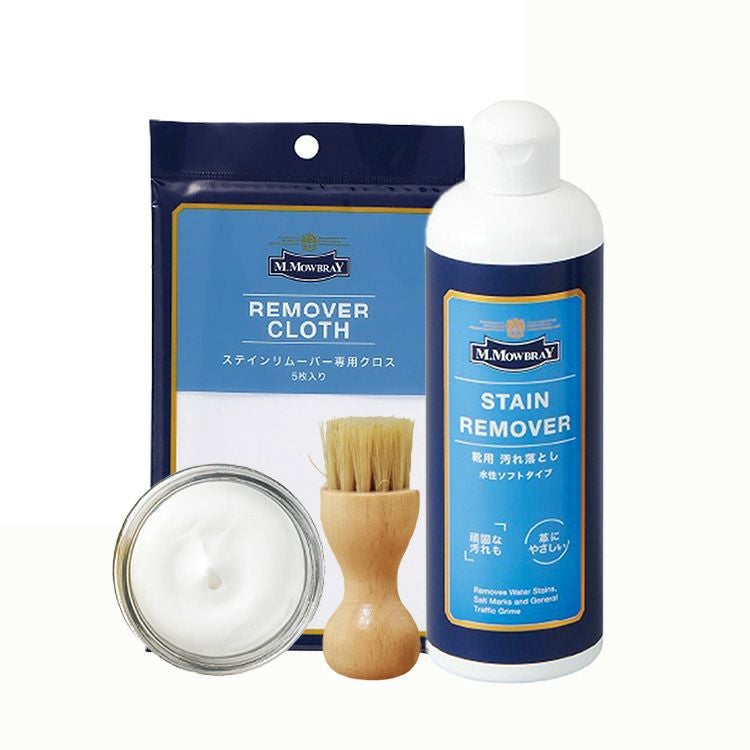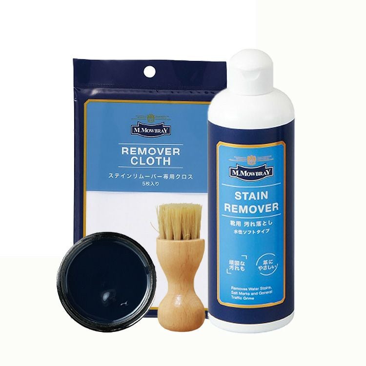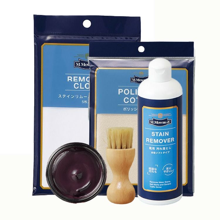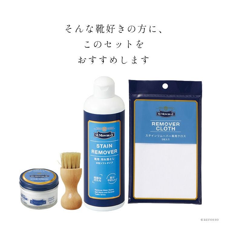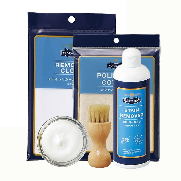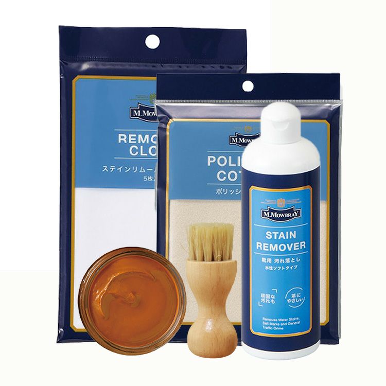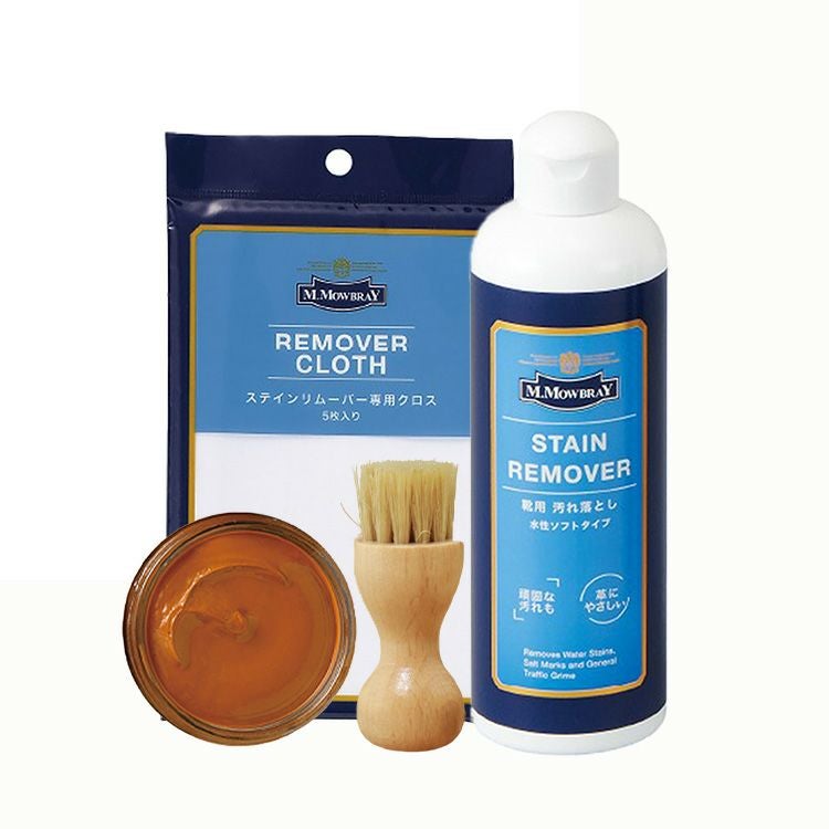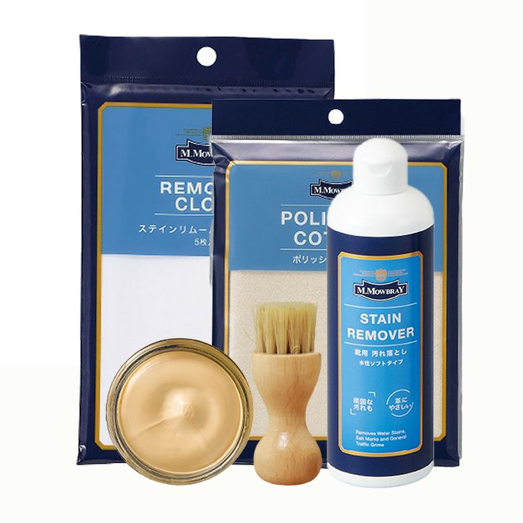 ヨーロッパで人気のシューケアブランド、M.MOWBRAY(モウブレイ)のステインリムーバーと高級な発色の革靴クリームをセットに、定番のペネトレィトブラシとリムーバークロス付き。 モウブレイ ステインリムーバー300 シュークリーム ジャー ブラシ クロス 靴 皮革 艶出し クリーム 手入れセット M.モゥブレィ M.MOWBRAY レザー お手入れ 靴磨き 革 スムースレザー ケア 大容量