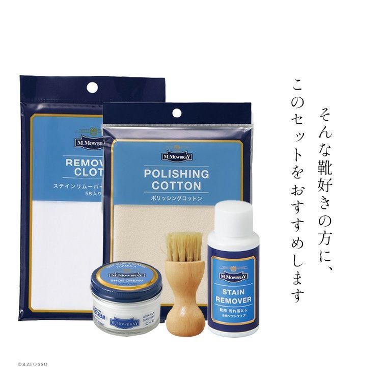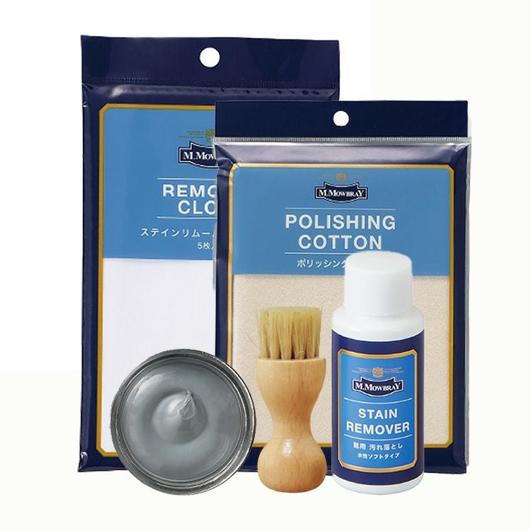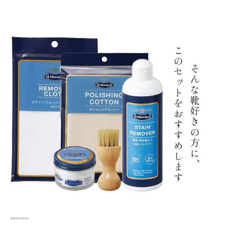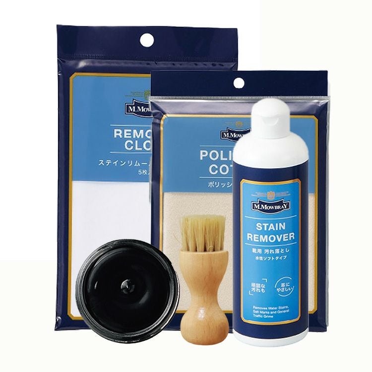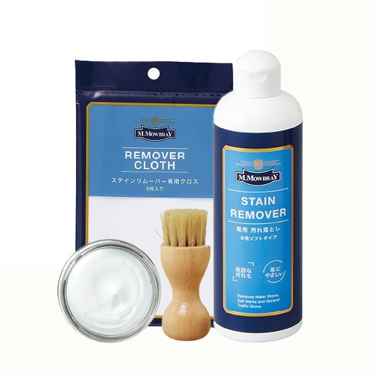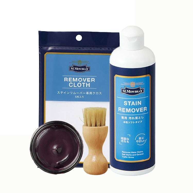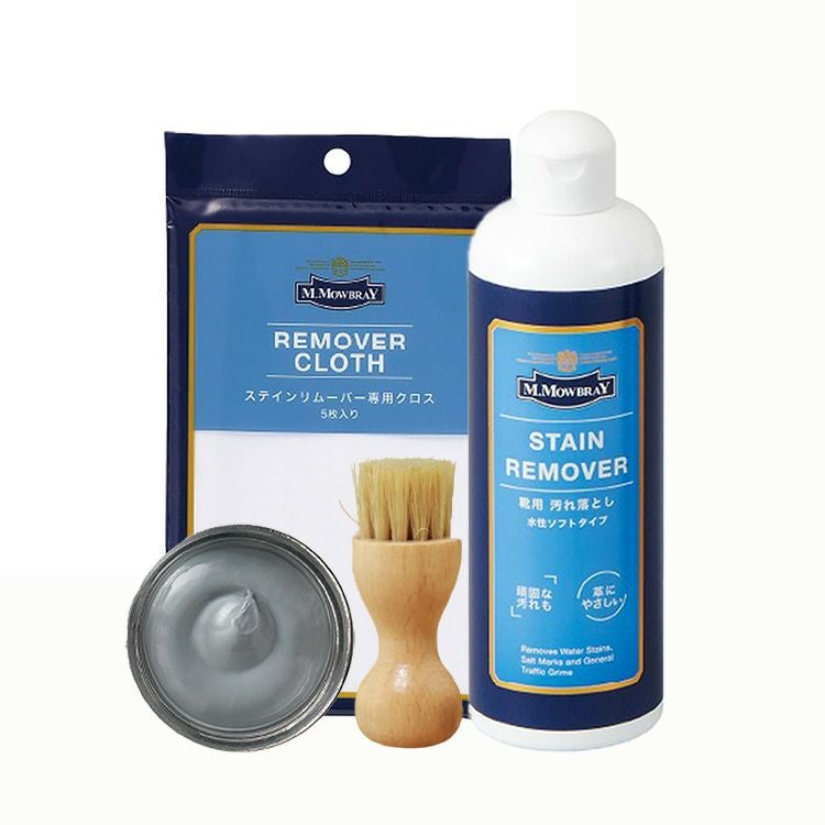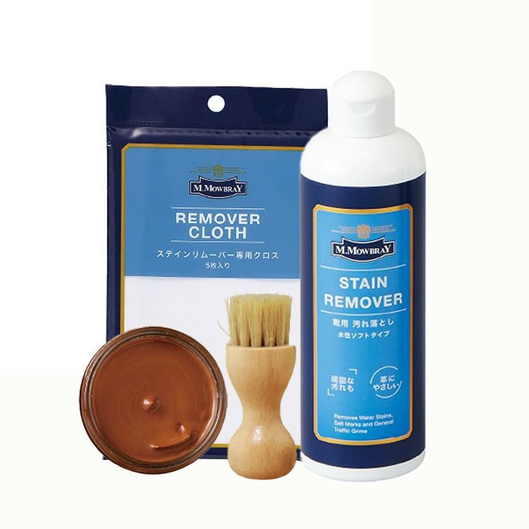 ヨーロッパで人気のシューケアブランド、M.MOWBRAY(モウブレイ)のステインリムーバーと高級な発色の革靴クリームをセットに、定番のペネトレィトブラシとリムーバークロス付き。 モウブレイ ステインリムーバー300 シュークリーム ジャー ブラシ クロス 靴 皮革 艶出し クリーム 手入れセット M.モゥブレィ M.MOWBRAY レザー お手入れ 靴磨き 革 スムースレザー ケア 大容量
