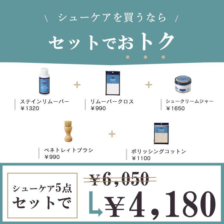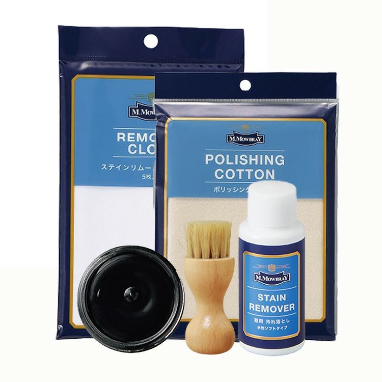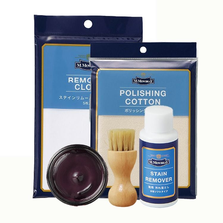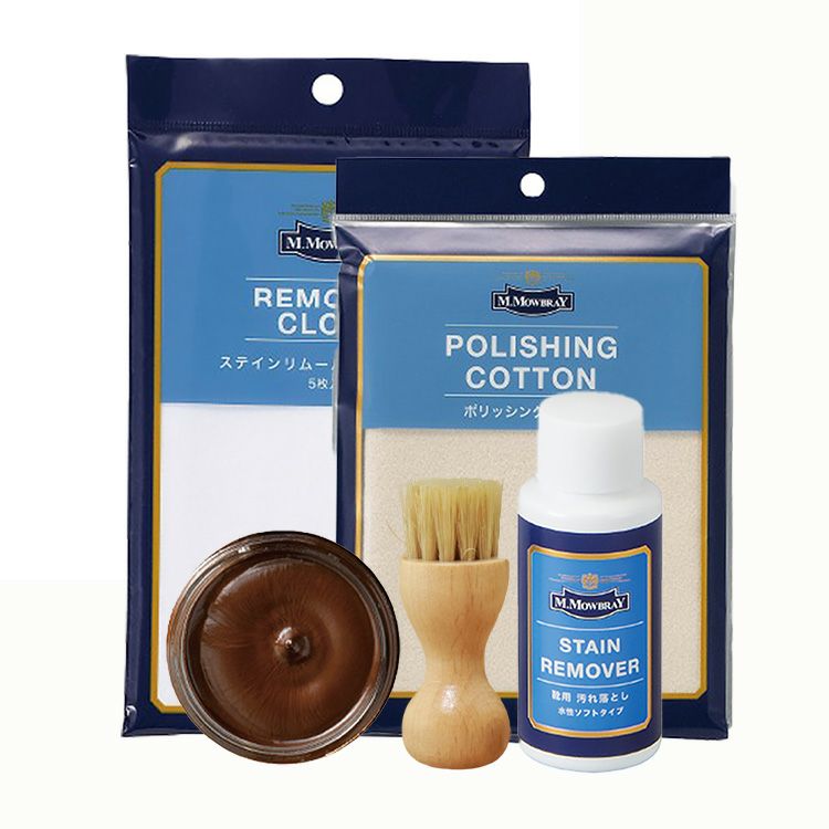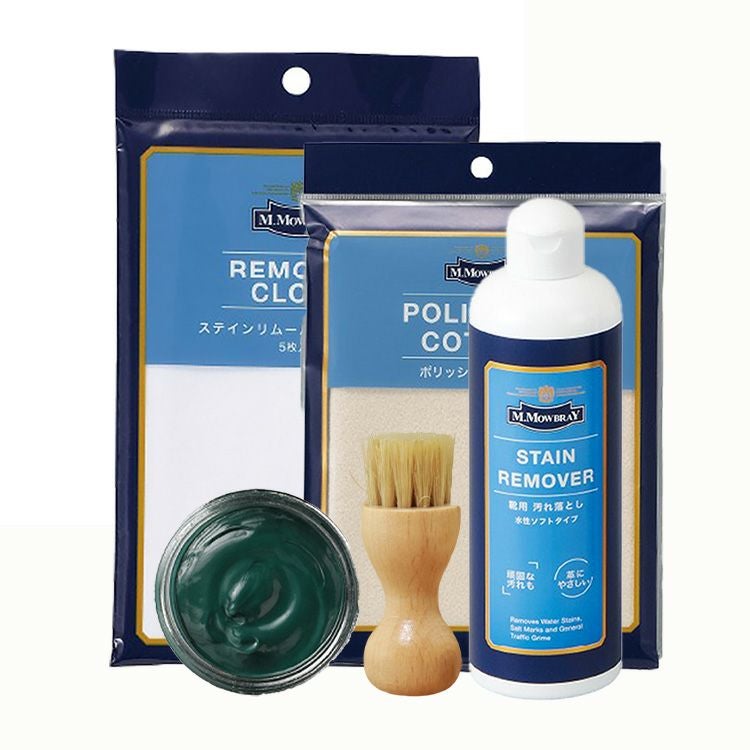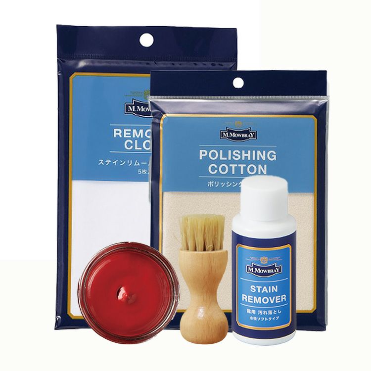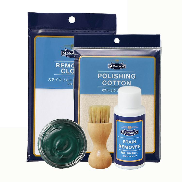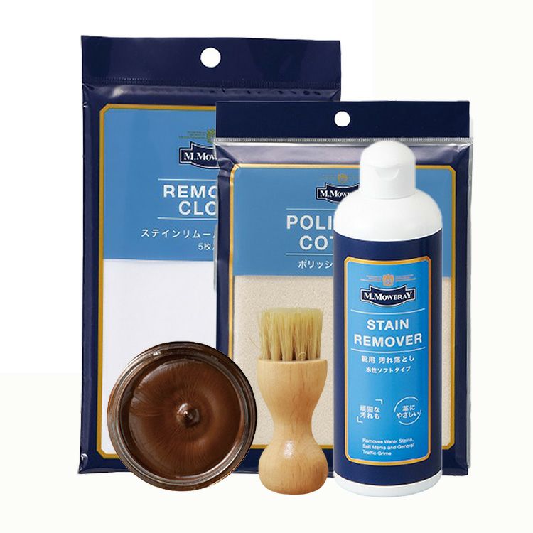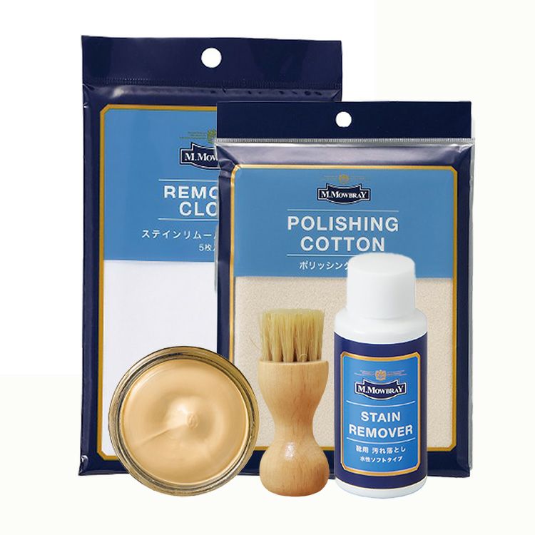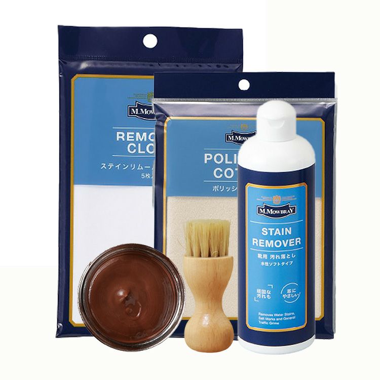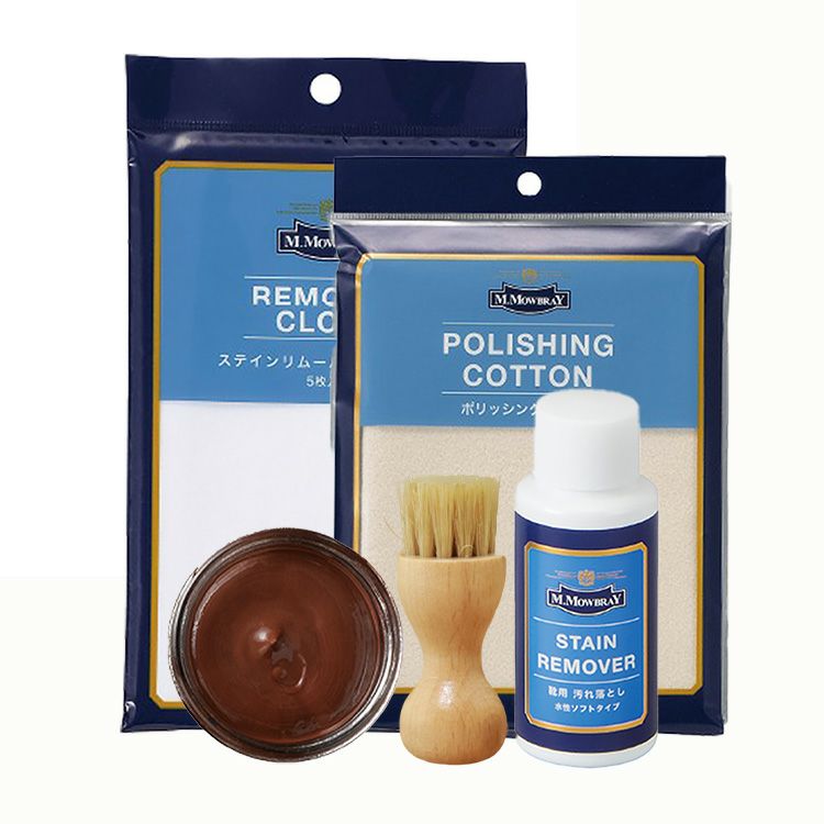 ヨーロッパで人気のシューケアブランド、M.MOWBRAY(モウブレイ)の高級な発色の革靴クリームセットに、定番のペネトレィトブラシとリムーバークロス、ポリッシングコットン付き。気にせず使える大容量300mlボトル。 モウブレイ ステインリムーバー 300ml シュークリーム ジャー ポリッシングコットン ブラシ クロス 靴 皮革 艶出し クリーム 手入れセット ト M.モゥブレィ M.MOWBRAY レザー お手入れ 靴磨き 革 スムースレザー ケア クリーム