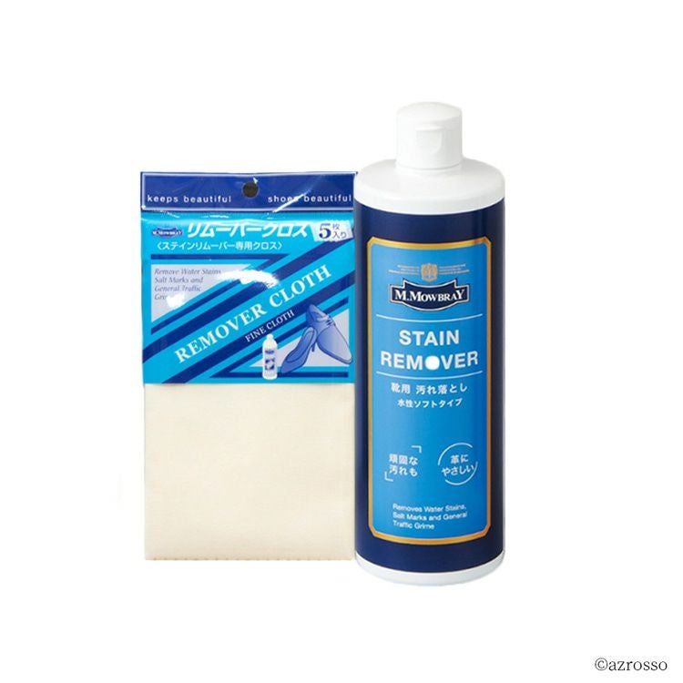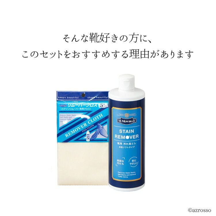 ヨーロッパで人気のシューケアブランド、M.MOWBRAY(モウブレイ)のステインリムーバーと専用クロスの汚れ落としセット。大容量の300mlタイプ。革靴の汚れをとるだけではなく、しなやかにします M.MOWBRAY シューケアセット ステインリムーバー リムーバークロス 革靴 汚れ落とし 靴磨き M.モゥブレィ