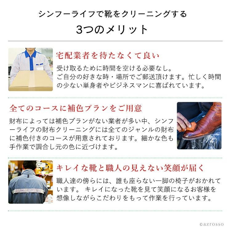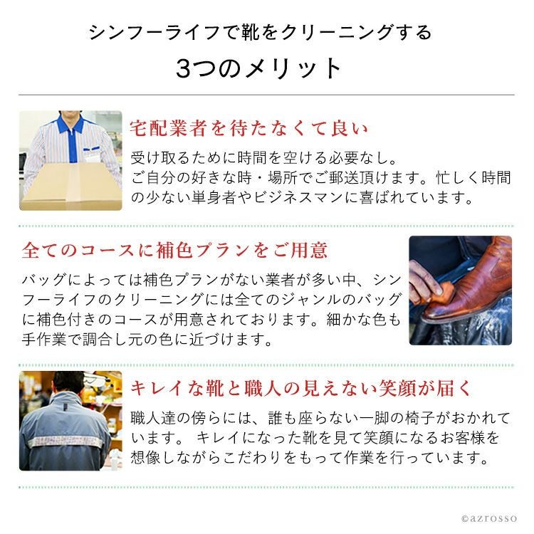 愛着をもって手に入れた靴、気に入っている靴ほどよく履くから汚れるものです。そしてそんな靴ほど、あなたの思い出がたくさんつまっていますよね。クリーニング職人達の傍らには、誰も座らない一脚の椅子がおかれています。 キレイになった靴を見て笑顔になるお客様を想像しながらこだわりをもって作業を行っているのです。 シンフーライフの靴クリーニングはすべて手作業の丸洗い。美しくなって戻った靴の1足1足に、プロのクリーニング職人達の笑顔がプラスされます。