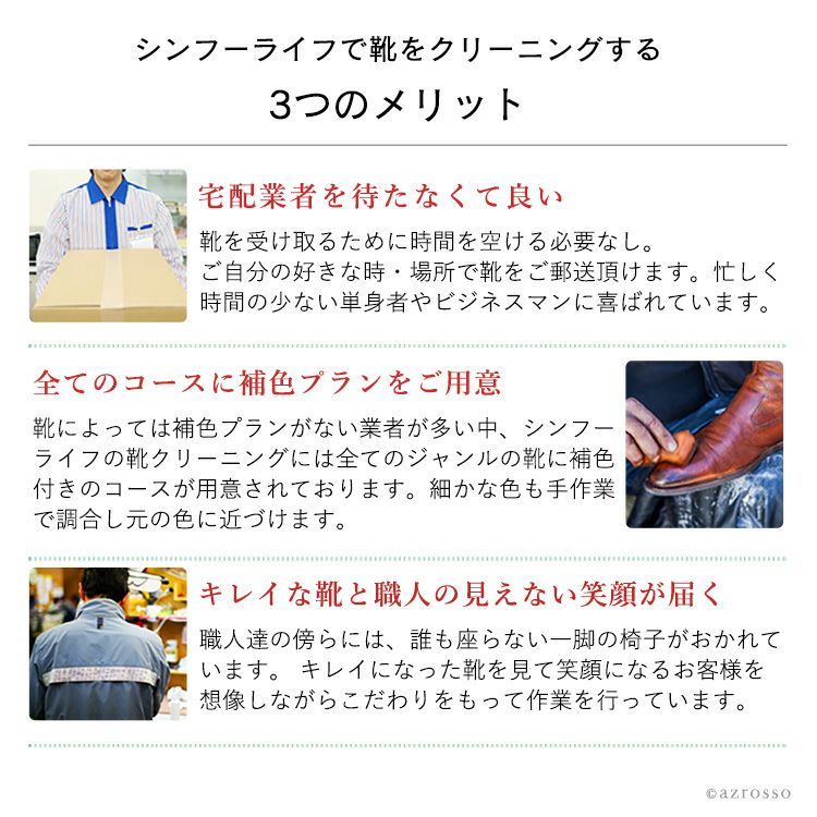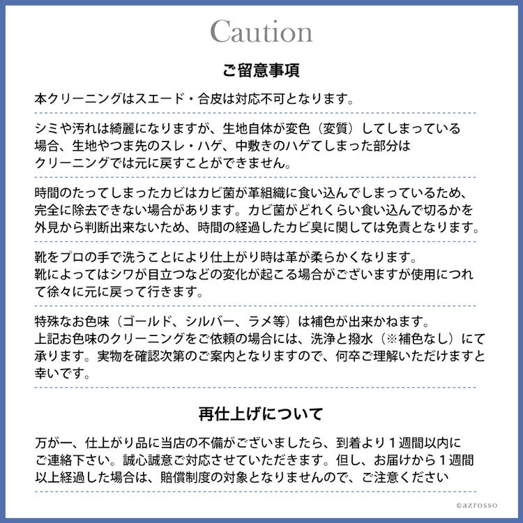 汚れやシミ、カビ、ニオイを除去し、革にタンパク質、脂質、コラーゲンを与え、キレイに除菌と消臭をしながら手洗いで1足1足丁寧に洗い上げます。