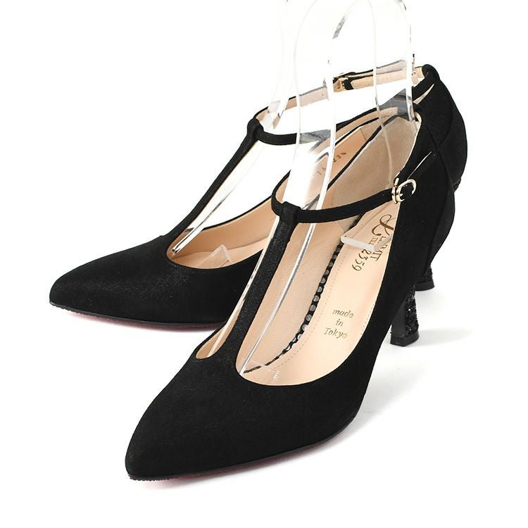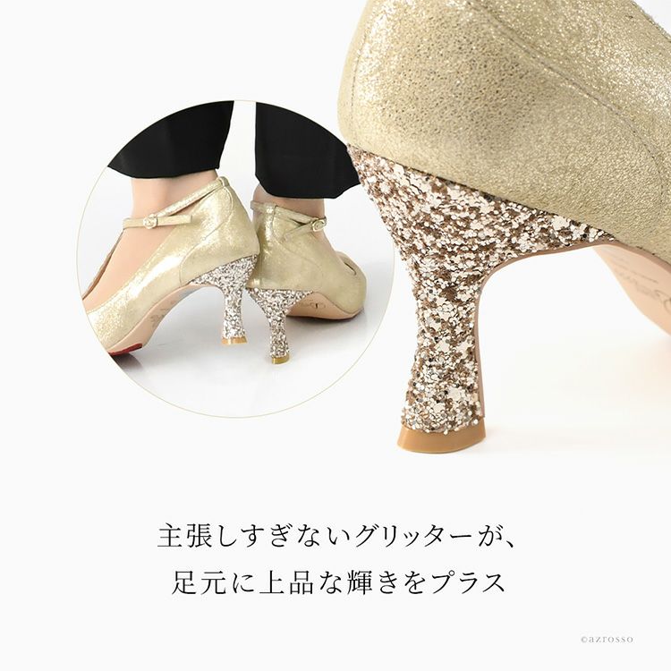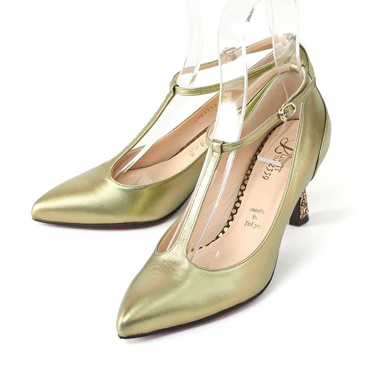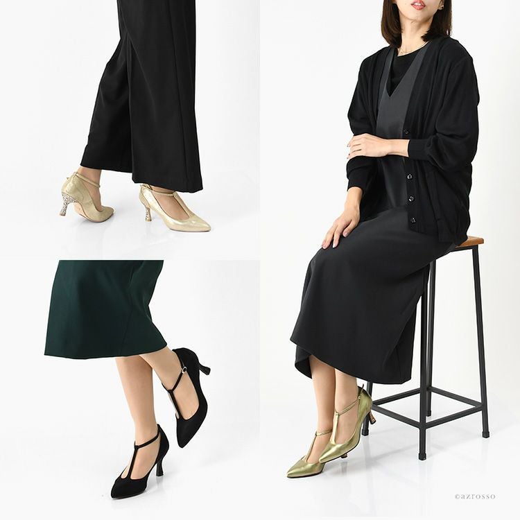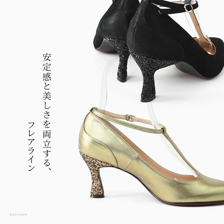 雨の日でも履けるレザーパンプス。Tストラップが足元を美しく引き締め、メタリックやグリッターの輝きが装いを格上げ。雨の日でもきちんと見え。デイリーからフォーマル、パーティーまで活躍するハイヒール。 晴雨兼用 本革 ストラップ パンプス 日本製 ハイヒール ポインテッドトゥ 7cm ヒール ブラック メタリック ゴールド レザー グリッター パーティー