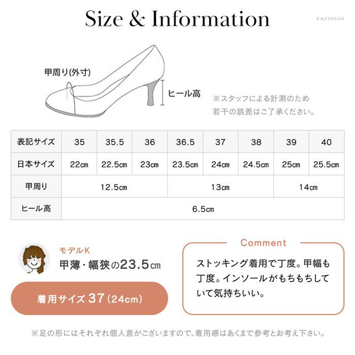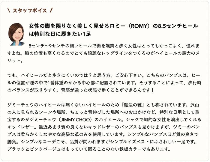ハイヒールよりも清楚な印象で、エレガンスな雰囲気も持てるパンプス。単に足が長く見えるだけでなく、6-8cmのヒールは足の甲が正面から見たときに筋が見えやすく、美しい足の曲線を表現できるため、デイリーで最も履かれるタイプのパンプスです。