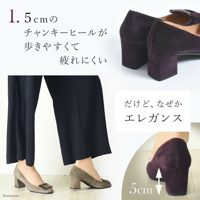 スクエアトゥの落ち着いた印象に加えて、ローヒールの歩きやすさが、ビジネスシーンで大活躍の一足。長時間履いても疲れにくく痛くなりにくいデザインです。