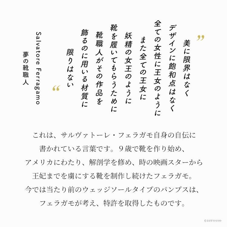フェラガモといえば定番の【ヴァラ】であるリボンパンプスをはじめ、バレリーナシューズやブーツなども常に斬新でエレガントな靴を生み出し続けています。