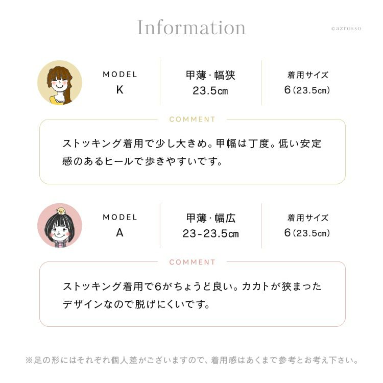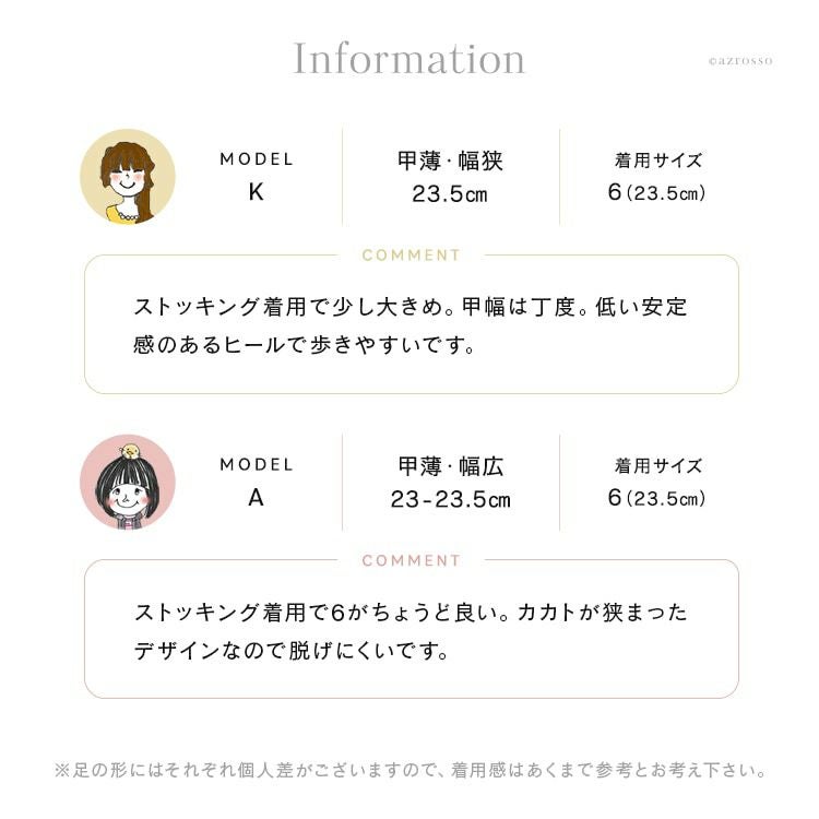 コメント:ストッキング着用で少し大きめ。甲幅は丁度。低い安定感のあるヒールで歩きやすいです。