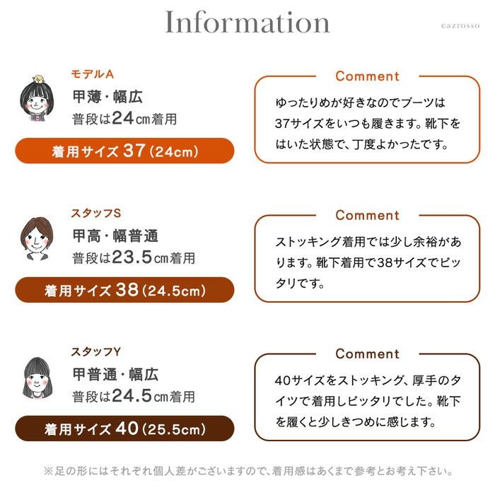 コメント:ゆったり目が好きなのでブーツは37サイズをいつも履きます。靴下を履いた状態で37サイズがちょうどよかったです。