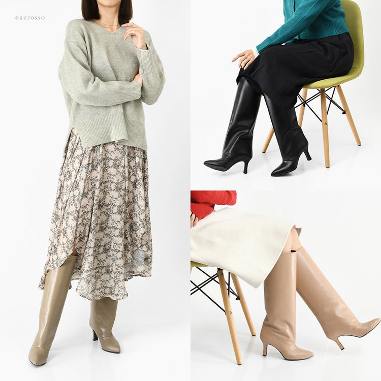 ▼特徴:ロング ブーツ 筒大きめ 筒太 きれいめ 革 晴雨兼用 革 黒 ブラック グレージュ ベージュ ハイヒール カジュアル 疲れない 歩きやすい 防寒 小さいサイズ 大きいサイズ
