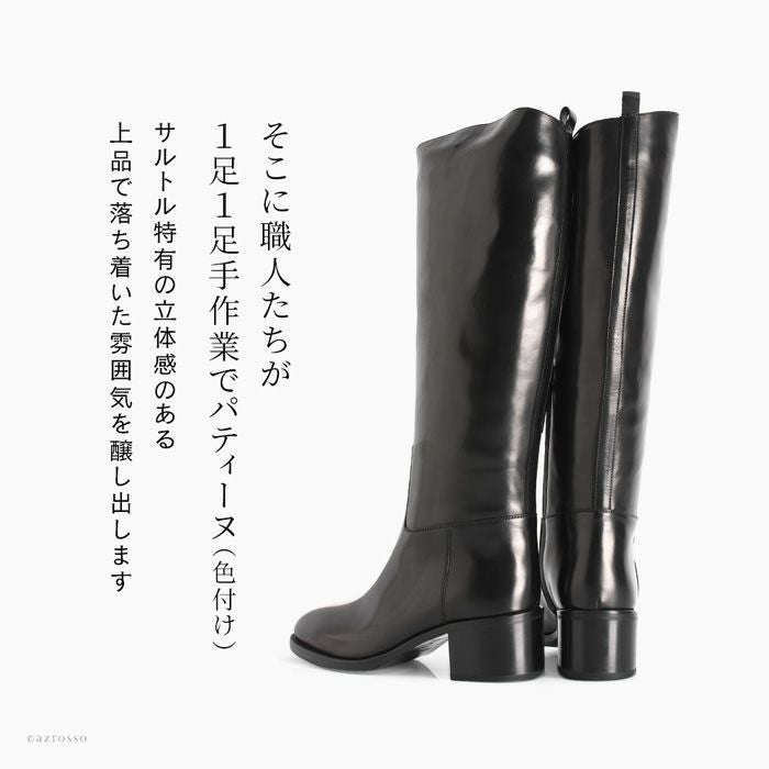 南フランス、ニースの北に位置するブレイユ=シュル=ロワイヤという小さな町の、小さな靴屋のサルトル夫妻が、1959年に起こした靴工場が「サルトル」の始まりです。ヨーロッパでは貴族のたしなみとされていた乗馬のためのブーツは、ユニセックスでありながら上品で洗練されたデザインのものが多く作られました。そこに、サルトルが出会います。様々な色を重ねることで生みだされる、あの神秘的な深い革色を引き出す「パティーヌ」と呼ばれるサルトル オリジナルの染色方法で染め上げた上質ななめし皮。それを、熟達した職人が丁寧に作り上げたジョッキーブーツは、履いたときの抜群のフィット感と、ため息が漏れそうな美しいシルエットで人々を魅了し始めます。