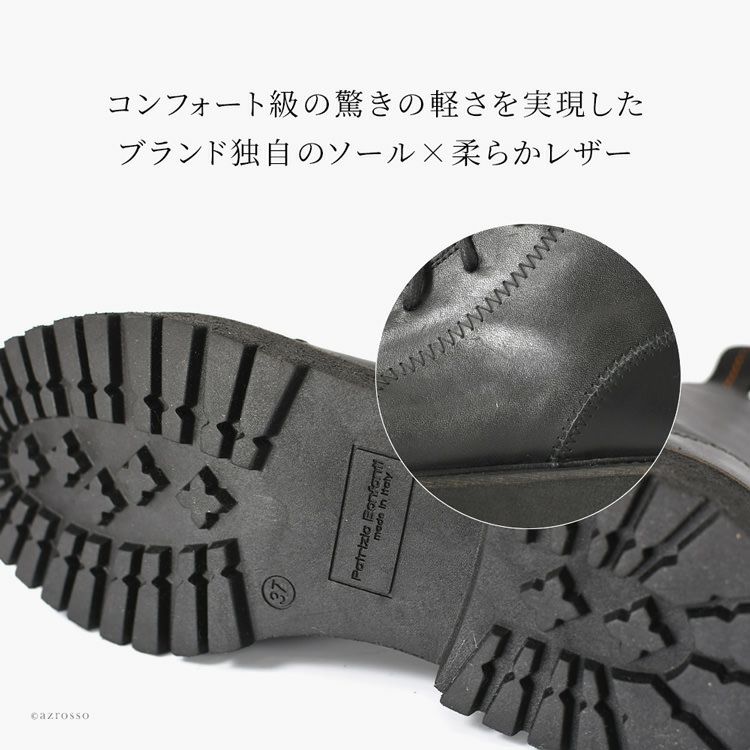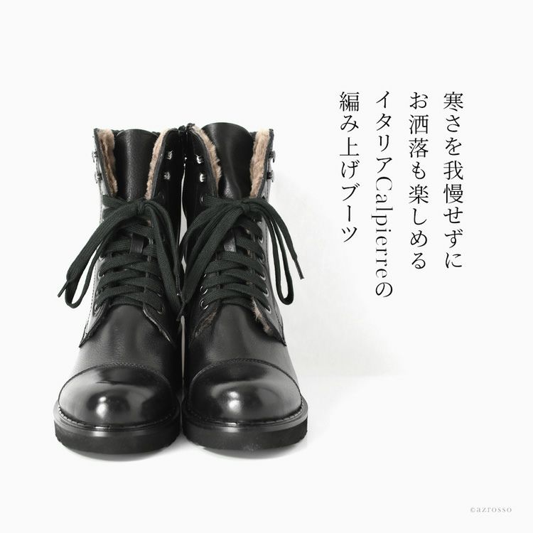 コンバットブーツをタウンユースに落とし込んだクールなデザイン。イタリアンカーフの上品なツヤが、どんなコーデも上質に。黒いボトムスと合わせてクラシックな雰囲気に。