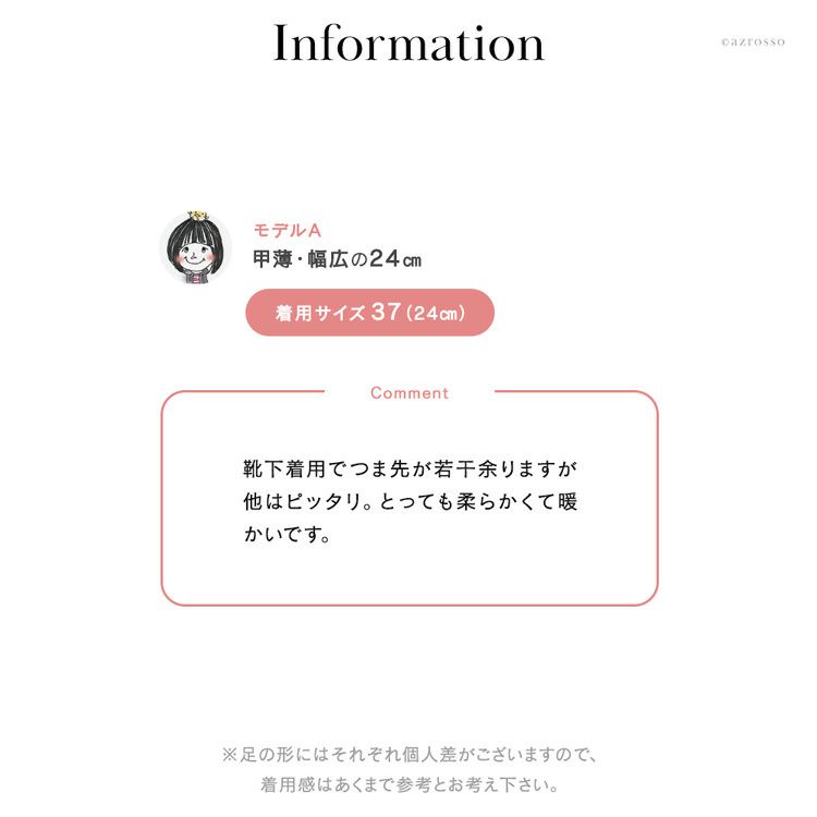 コメント:靴下着用でつま先が若干余りますが他はピッタリ。とっても柔らかくて暖かいです。