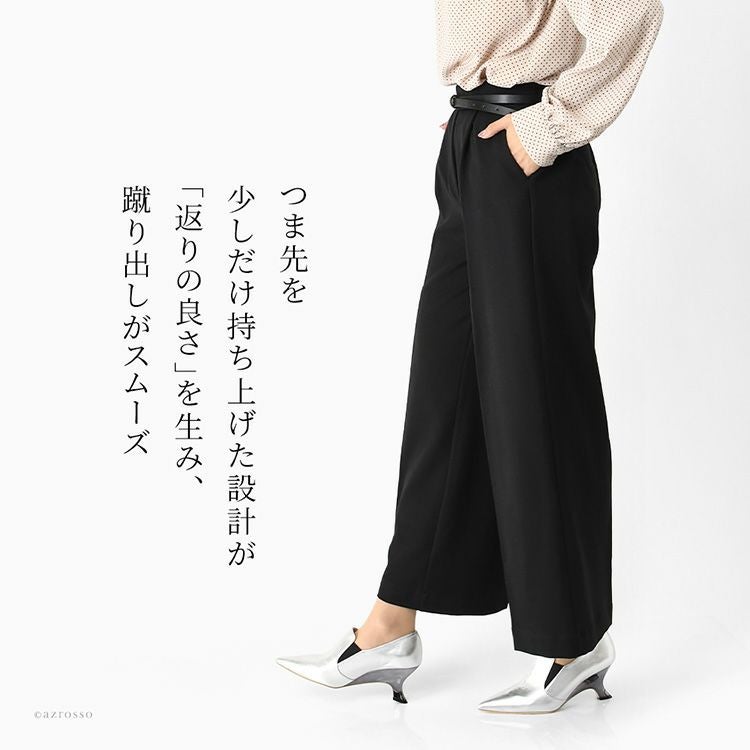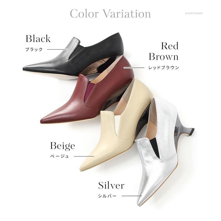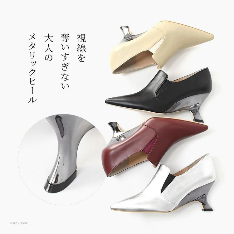 最大の魅力は、彫刻的な造形美を放つメタリックなウェッジヒール。正面は凛とした表情のポインテッドトゥ。そして歩き出す瞬間に、踵の輝きが知的な遊び心を覗かせます。この「さりげないギャップ」こそが、周囲にハッと思わせる洗練の正体。主張は控えめ、だけど確実にお洒落の純度を120%へ引き上げる、計算されたデザインです。