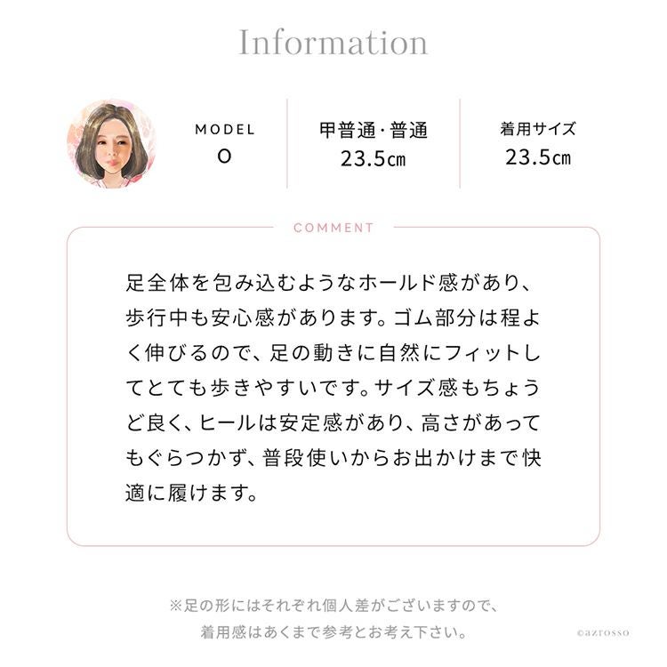 コメント:足全体を包み込むようなホールド感があり、歩行中も安心感があります。ゴム部分は程よく伸びるので、足の動きに自然にフィットしてとても歩きやすいです。サイズ感もちょうど良く、ヒールは安定感があり、高さがあってもぐらつかず、普段使いからお出かけまで快適に履けます。