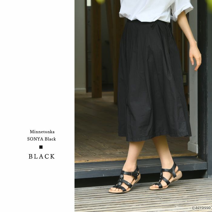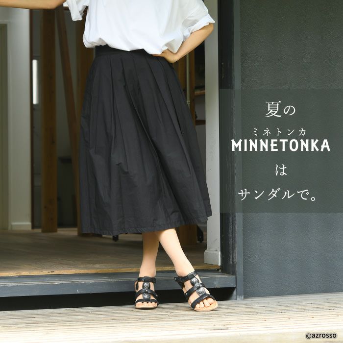 ミネトンカの夏サンダル。履きやすい、かわいいと人気のシューズブランド Minnetonka コンチョをあしらったレザーサンダル。こだわりのインソールで素足でも疲れない痛くない。ブラック 黒 グレー ゴールドをご用意 ミネトンカ Minnetonka ボカスライド Boca slide スエードレザー サンダル 大きい サイズ 25cm 26cm 27cm