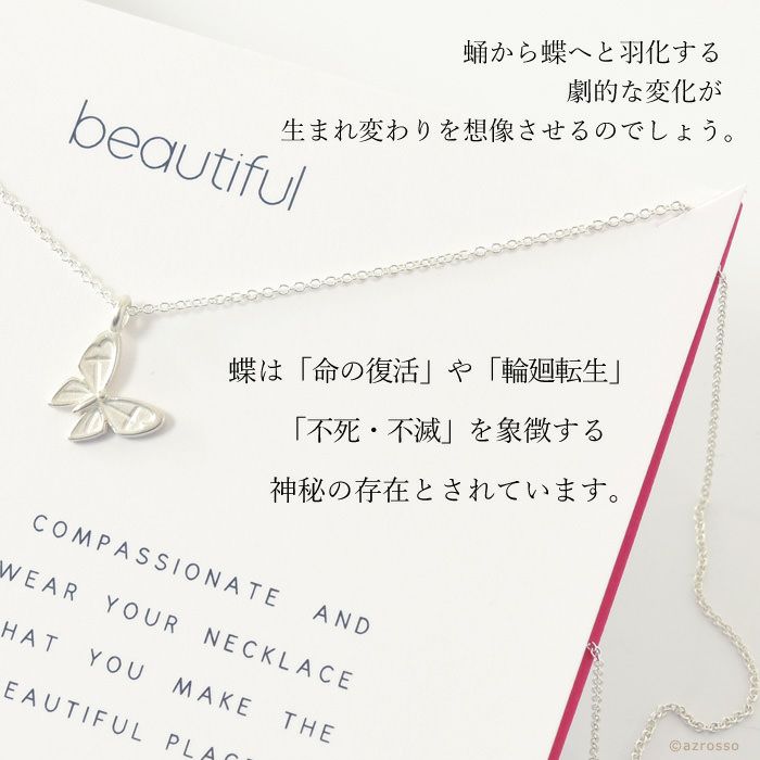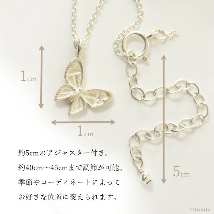 メッセージが込められた蝶のチャームと華奢なシルバーチェーンは、アクセサリーとしても美しく、女性のデコルテを美しく魅せ、洗練された大人の美しさを後押ししてくれます。