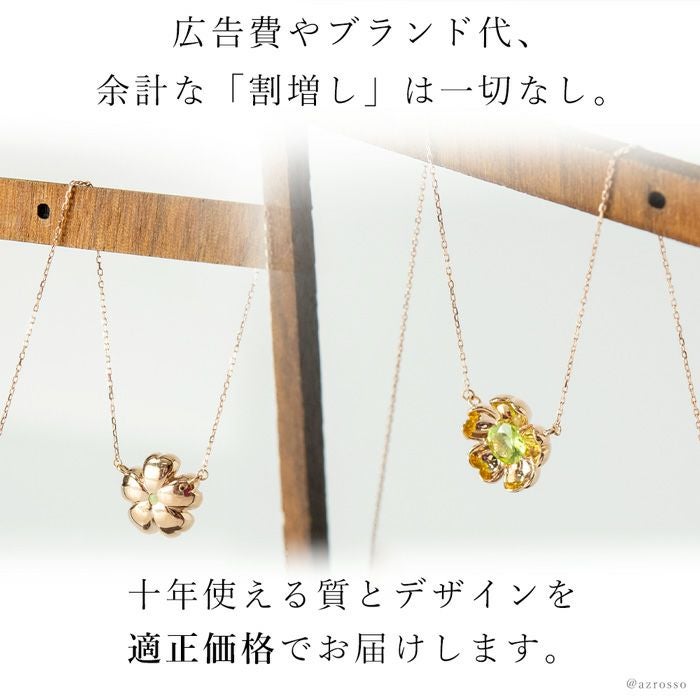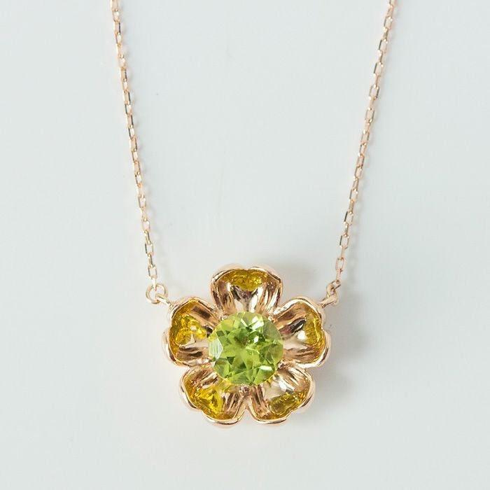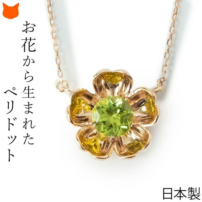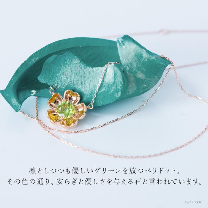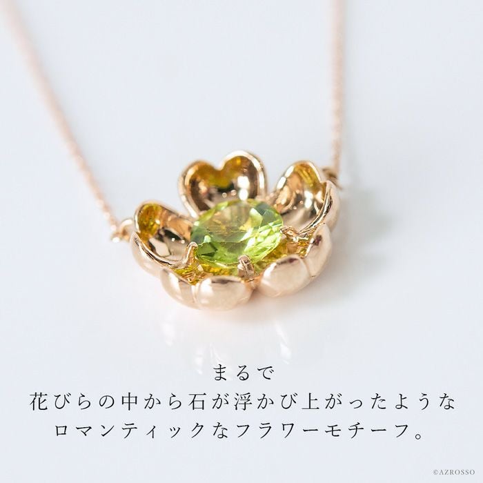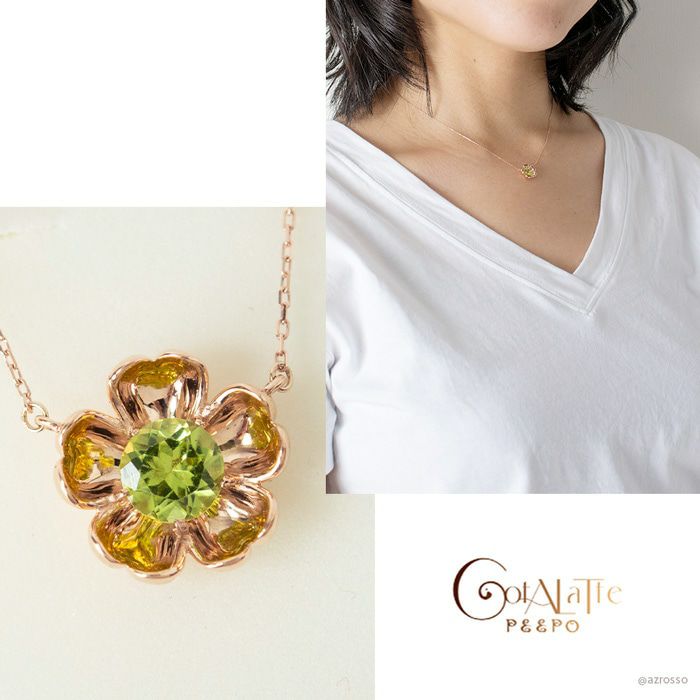 日本の一流職人の手から生まれる飽きない高級感。花びらの中からペリドットが浮かび上がったようなロマンティックなフラワーモチーフのCotalatte Peepo(コタラッテピーポー)のネックレス ペリドット ネックレス ピンクゴールド フラワーモチーフ 日本製 アクセサリー コタラッテピーポー レディース