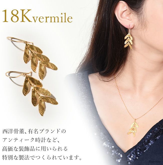 フォーマルな場面に着けるピアスは、素材にもこだわりたいもの。こちらのピアスは、西洋骨董や、有名ブランドのアンティーク時計など、高価な装飾品に用いられる製法「18Kヴェルメイユ」でつくられています。ヴェルメイユとは、銀無垢に金を貼りつける加工技術の事を言い、溶かした金を吹き付ける「メッキ」とは違い、この技法を施したジュエリーはとても高価なものになります。