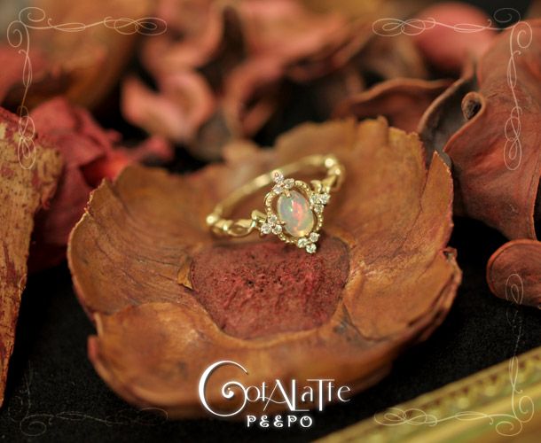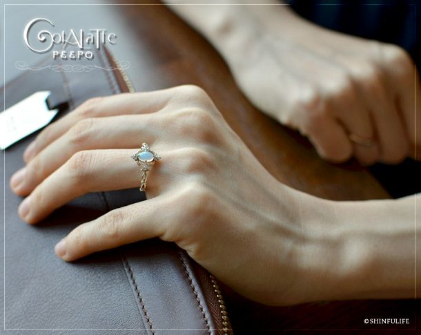 今回はロココアンティークデザインのオパールリングをご紹介。カボションカットのオパールとアンティーク調に配されたメレダイヤがやさしい輝きをみせます。