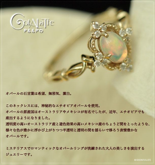 オパールの石言葉は希望、無邪気、潔白。このネックレスには、神秘的なエチオピアオパールを使用。ミステリアスでロマンティックなオパールリングが洗練された大人の美しさを演出するジュエリーです。