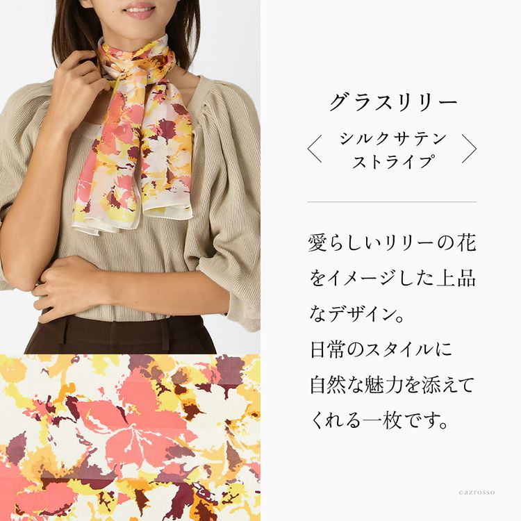 グラスリリー シルク サテン ストライプ 花柄 シルク100% 30cm×130cm 日本製 横浜スカーフ【通常ネコポス配送】