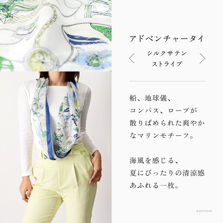 アドベンチャータイ シルク サテンストライプ ループスカーフ かぶるだけ マリン柄 シルク100% 薄手 日本製 横浜スカーフ【通常ネコポス配送】