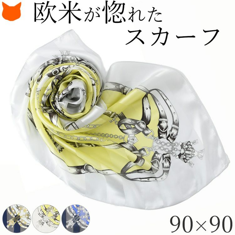 4. シルク スカーフ 大判 正方形 90 日本製 シルク100% レディース 手綱エルメス2 ネイビー ブルー 紺 青 黄色 ベージュ サテン ストライプ エルメス 柄 馬具柄 横浜スカーフ おしゃれ プレゼント