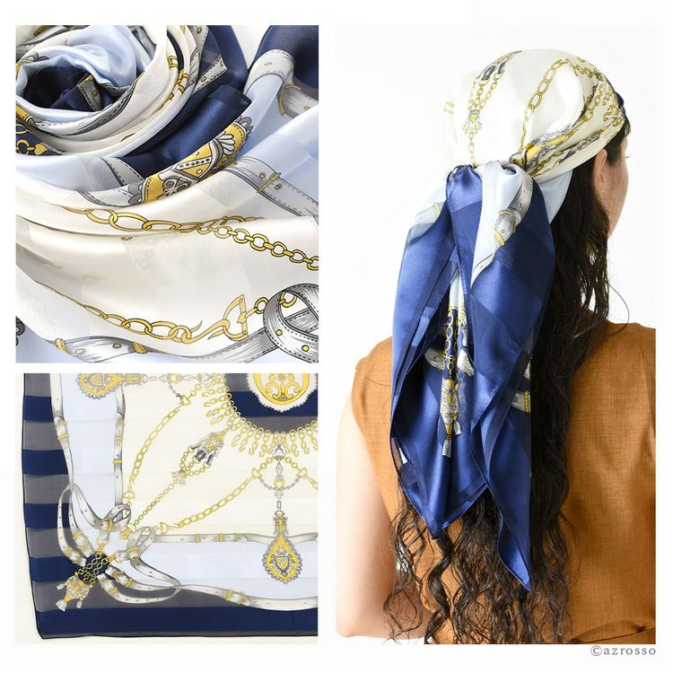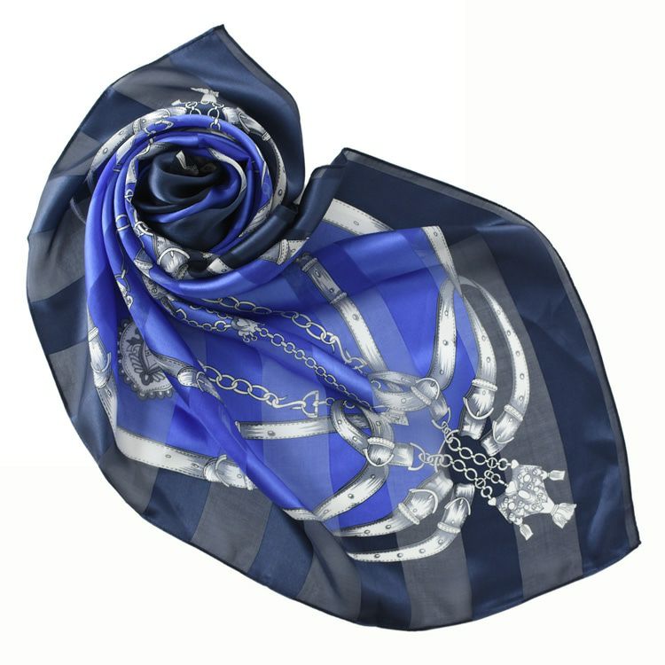 5. シルク スカーフ 大判 正方形 90 日本製 シルク100% レディース 手綱エルメス2 ネイビー ブルー 紺 青 黄色 ベージュ サテン ストライプ エルメス 柄 馬具柄 横浜スカーフ おしゃれ プレゼント
