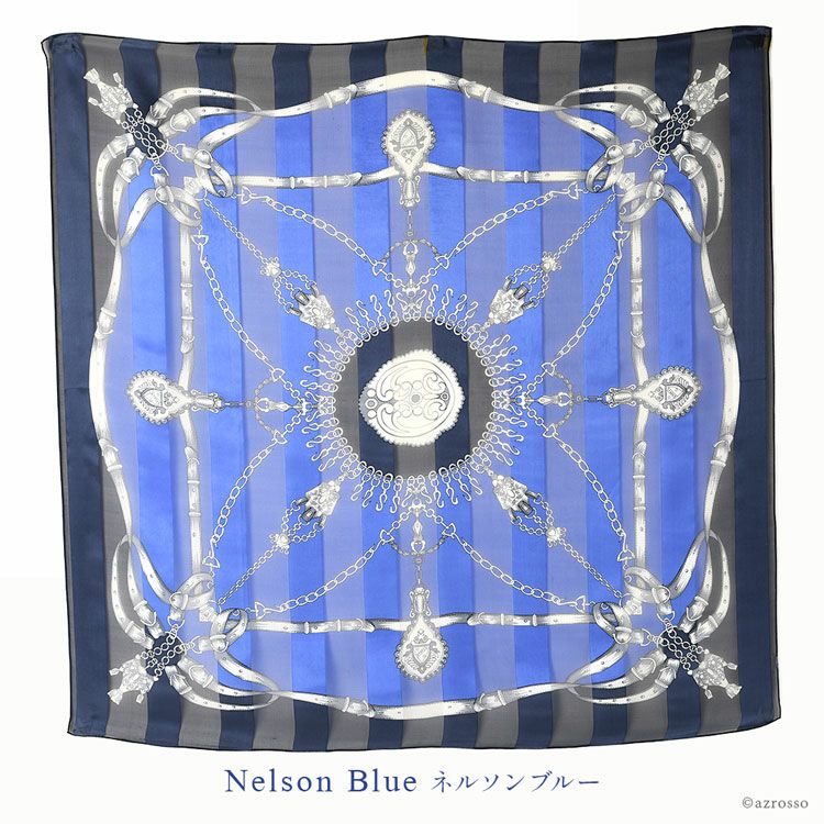6. シルク スカーフ 大判 正方形 90 日本製 シルク100% レディース 手綱エルメス2 ネイビー ブルー 紺 青 黄色 ベージュ サテン ストライプ エルメス 柄 馬具柄 横浜スカーフ おしゃれ プレゼント