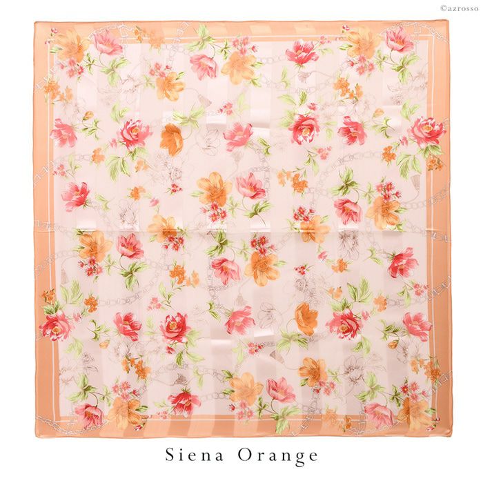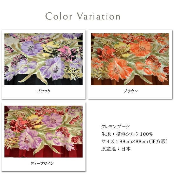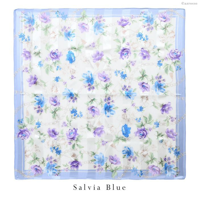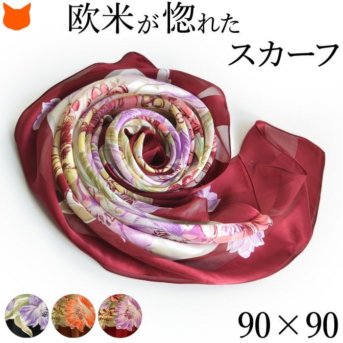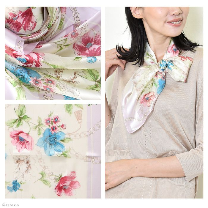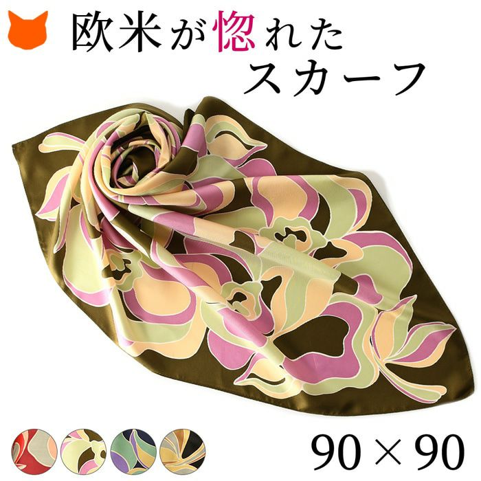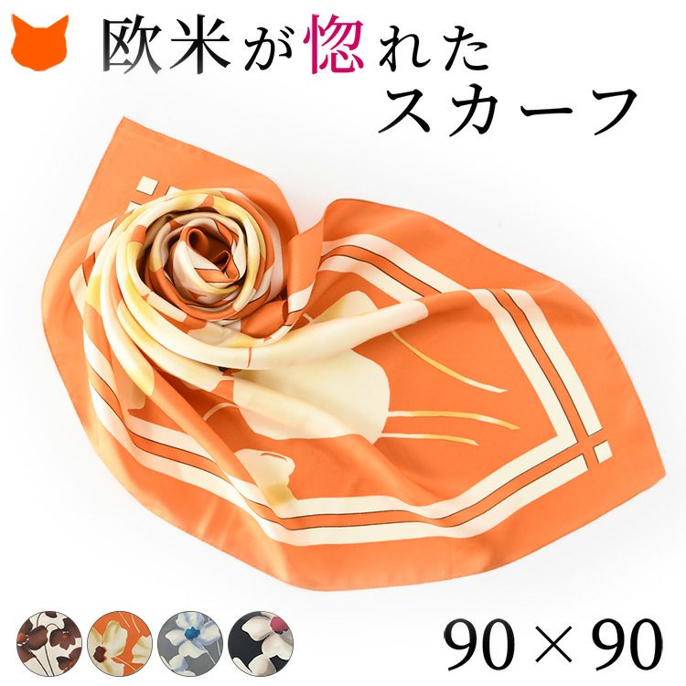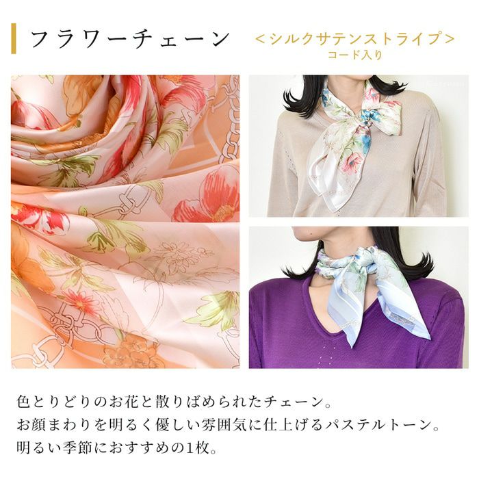 90×90|キヌフローレス(KINU flawless) の大きめの花柄が華やかなシルクスカーフ。母の日、敬老の日、女性への誕生日プレゼントにも フラワーチェーン 横浜スカーフ シルクサテンストライプコード入り 花柄 日本製 シルクスカーフ 大判 スカーフ 正方形 シルク100% 88×88cm