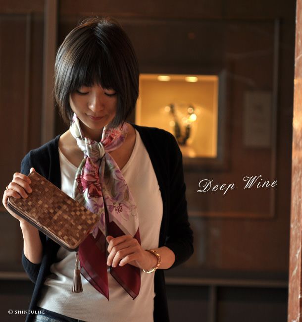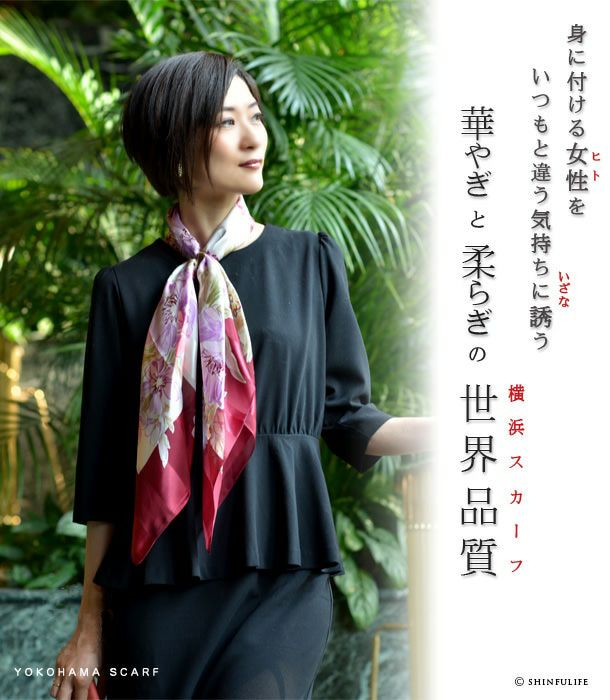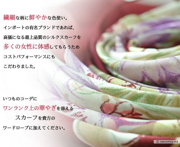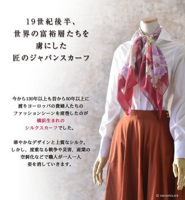 シンフーライフの花柄スカーフは、シルク100%の日本製だけでなく、イタリア製のシルクも取り揃えております。同じ花柄でも纏ったときの表情ががらりと変わるのが不思議