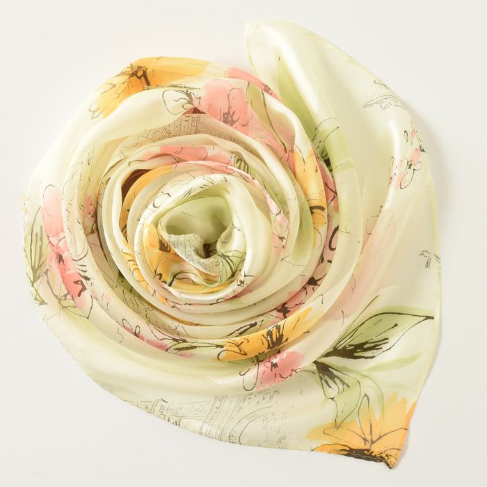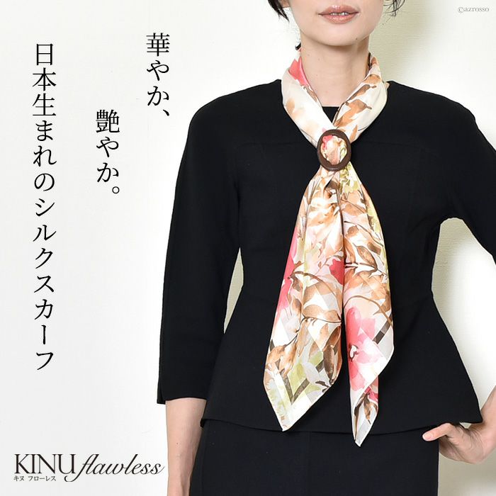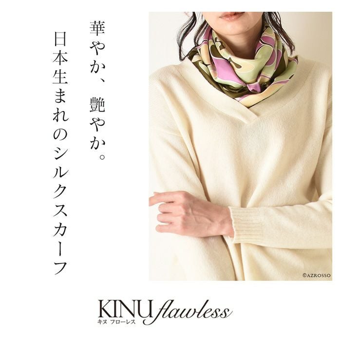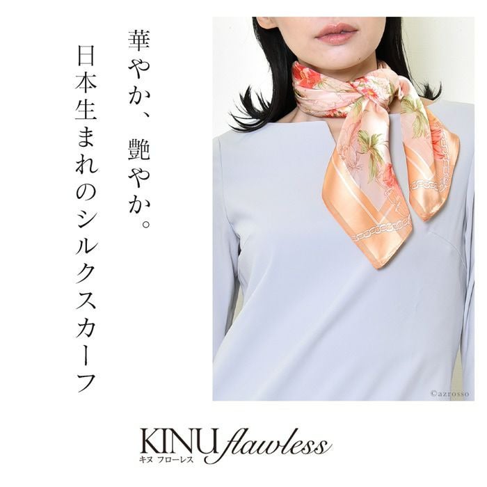 世界トップクラスの技術で紡ぐスカーフブランド キヌフローレス。正方形スカーフはベルトやバッグチャームとして巻くのも可愛い。お母さん 彼女 妻(奥さん)へのお祝いのプレゼントや記念日 誕生日ギフトに フローラル スカーフ シルク100% ツイル 横浜スカーフ 日本製 90×90 正方形 大判 花柄