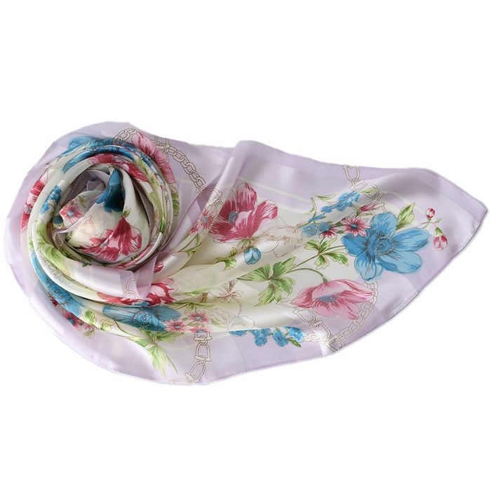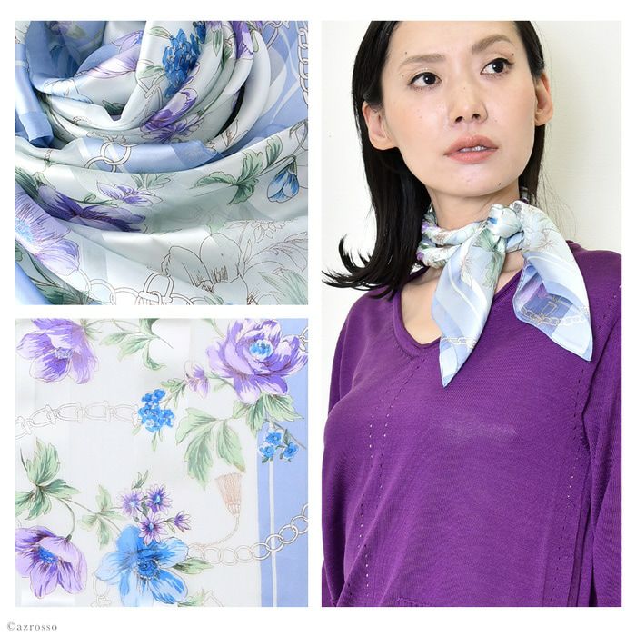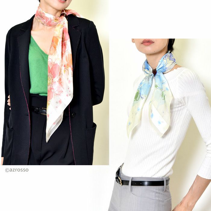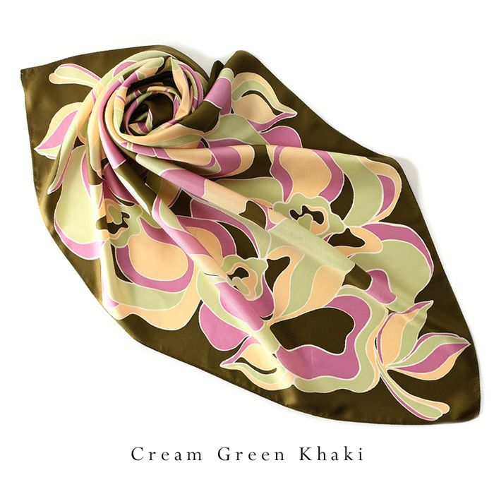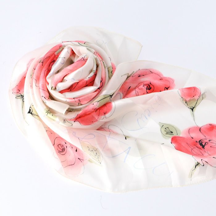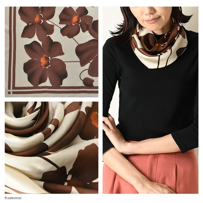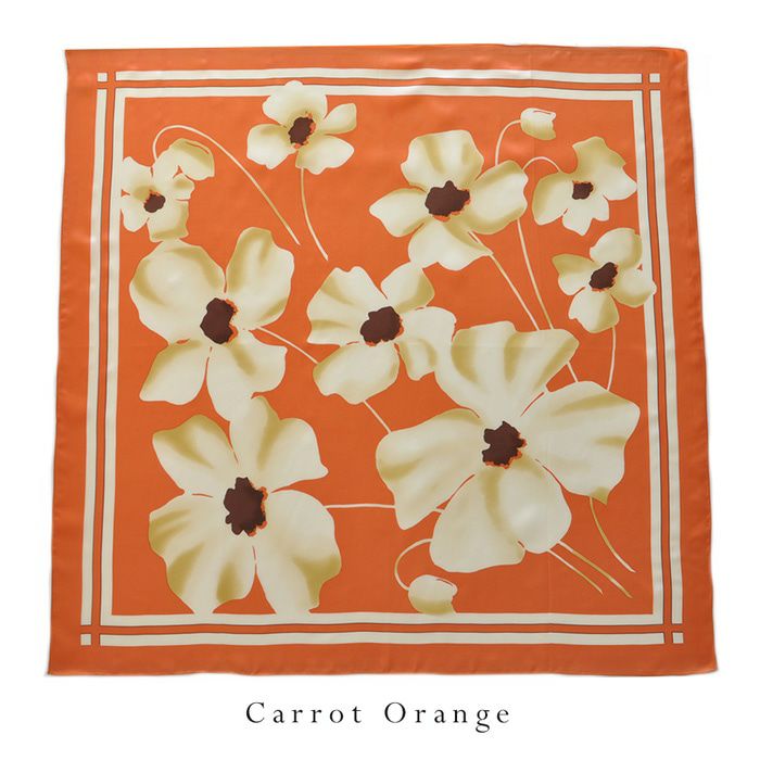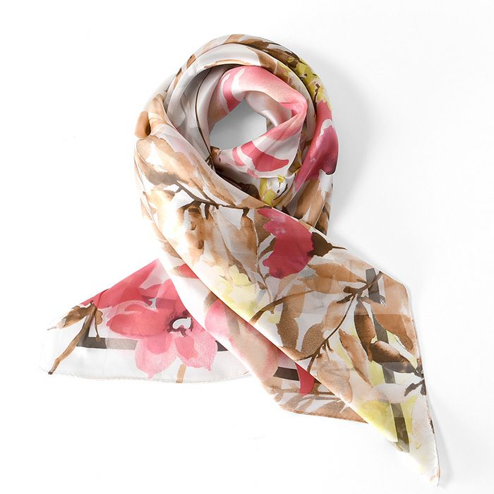 また、花柄のシルクスカーフは、若い女性から年配の女性まで幅広く人気で、さらに着こなしやすい柄。ですから、母の日や敬老の日のプレゼントにも汎用性が高く好評。母娘兼用でお使いになられている方も少なく有りません。