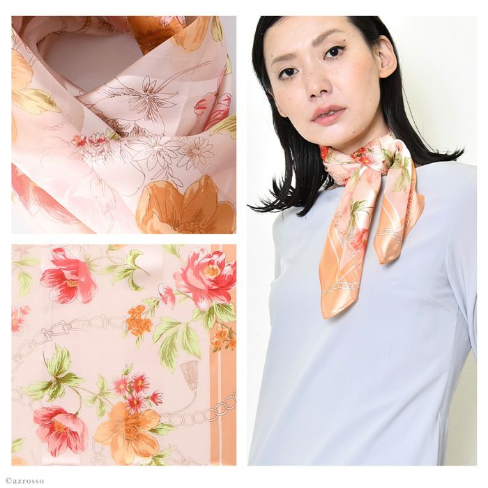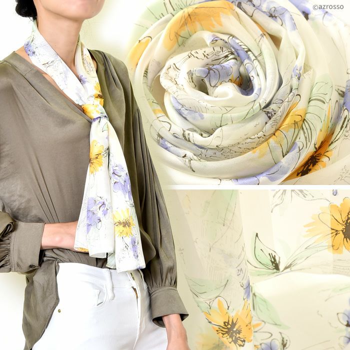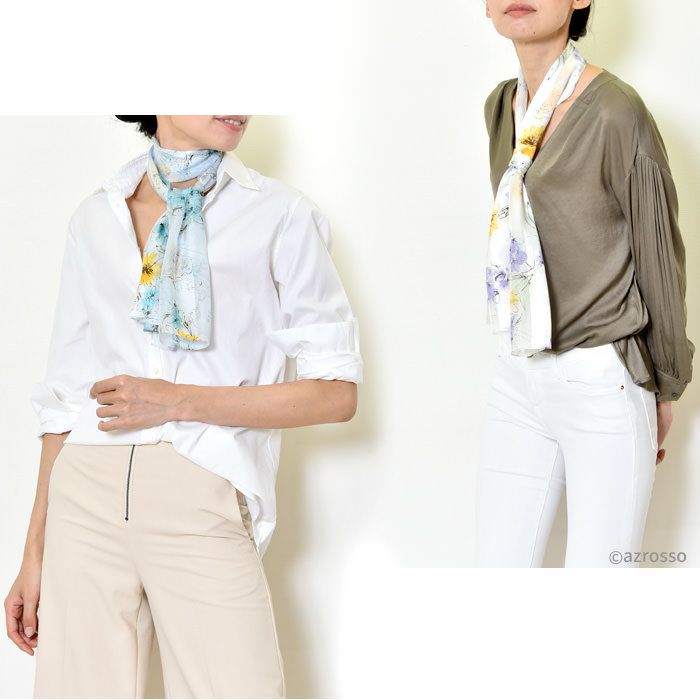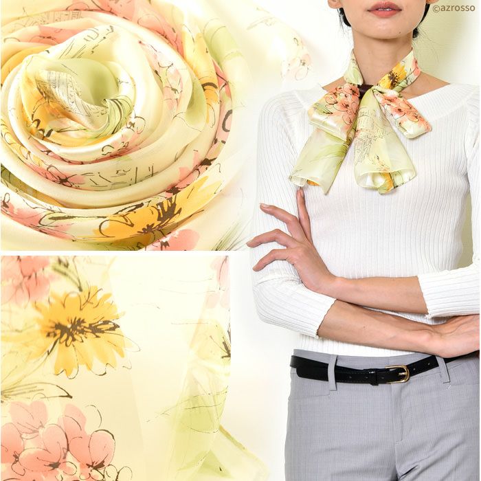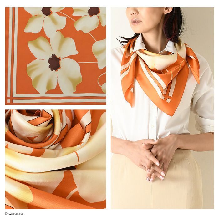シンプルなワンピースにひとつ合わせるだけで、パッと花が咲いたような明るい雰囲気を出してくれる花柄のシルクスカーフ。シルク100%であれば、高級感もそぐうことなく着こなしに華を添えてくれます。