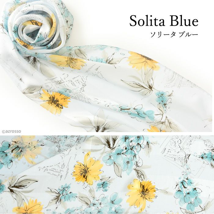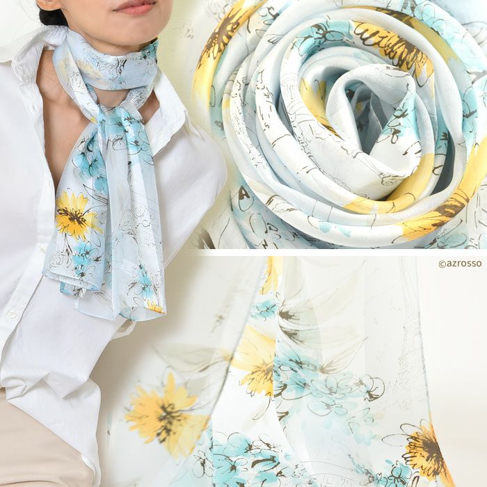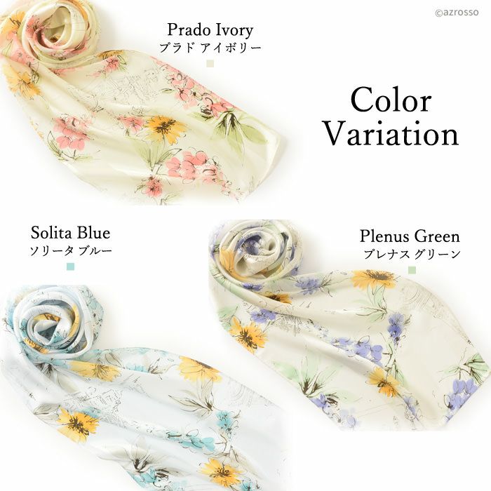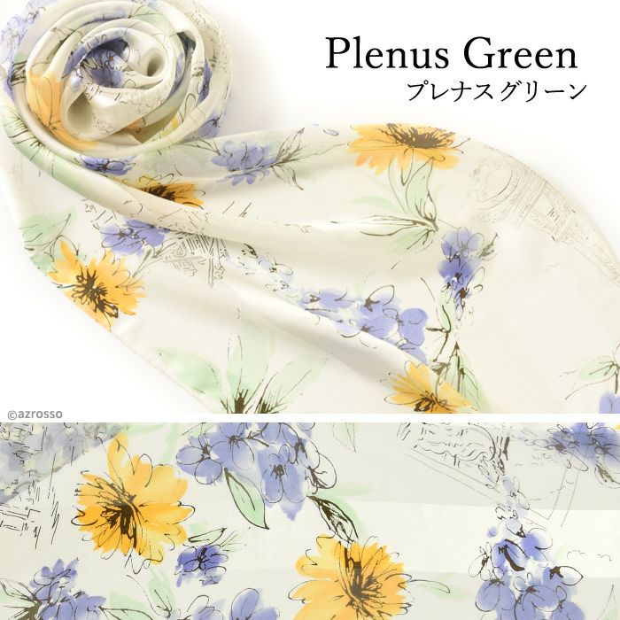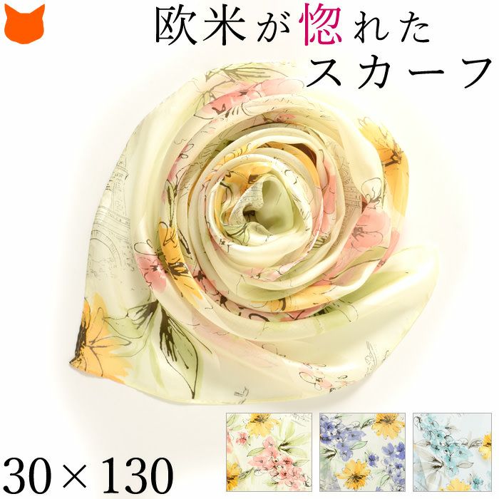 30×130|キヌフローレス(KINU flawless) の上品な花柄が散りばめられたシルクスカーフ。肌馴染みの良い淡い色彩が、コーデに華を添える上質スカーフ フルールパリ 横浜スカーフ 日本製 シルクスカーフ 大判 横浜スカーフ 長方形 クリーム ベージュ ブルー グリーン