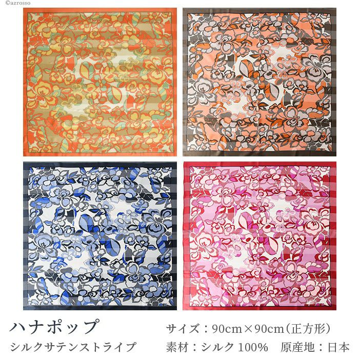 90×90|キヌフローレス(KINU flawless) のお洒落な花柄のシルクスカーフ。母の日、敬老の日、女性への誕生日プレゼントにも ハナポップ 横浜スカーフ シルクサテンストライプ 花柄 日本製 シルクスカーフ 大判 スカーフ 正方形 シルク100% 90×90cm