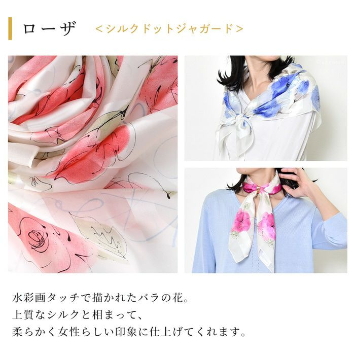 90×90|キヌフローレス(KINU flawless) の水彩画のような淡いバラ柄のシルクスカーフ。母の日、敬老の日、女性への誕生日プレゼントにも ローザ 横浜スカーフ シルクドットジャガード 花柄 日本製 シルクスカーフ 大判 スカーフ 正方形 シルク100% 88×88cm