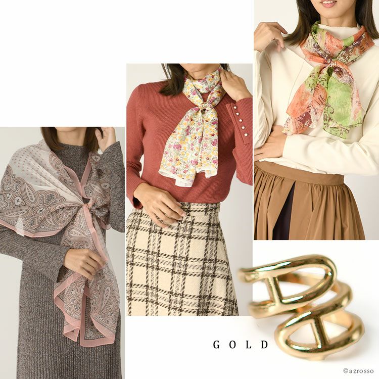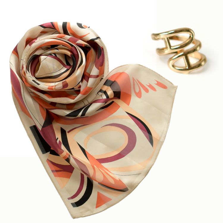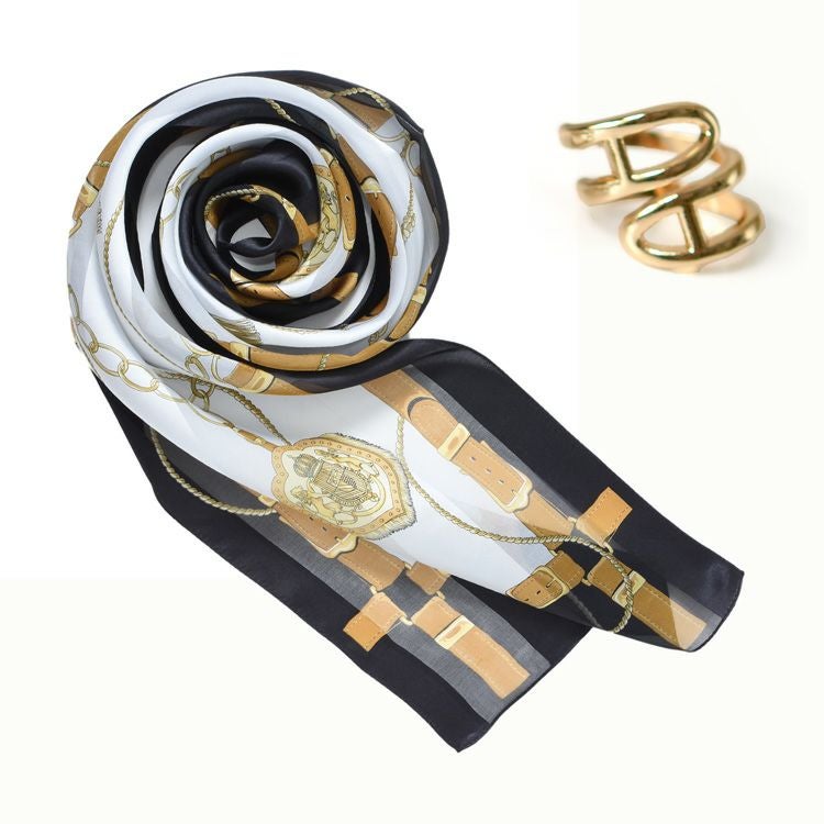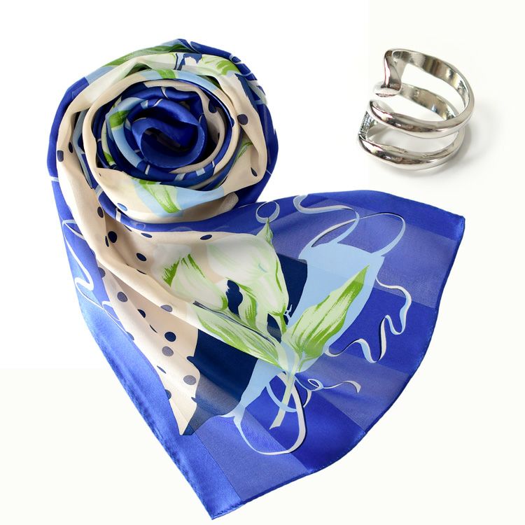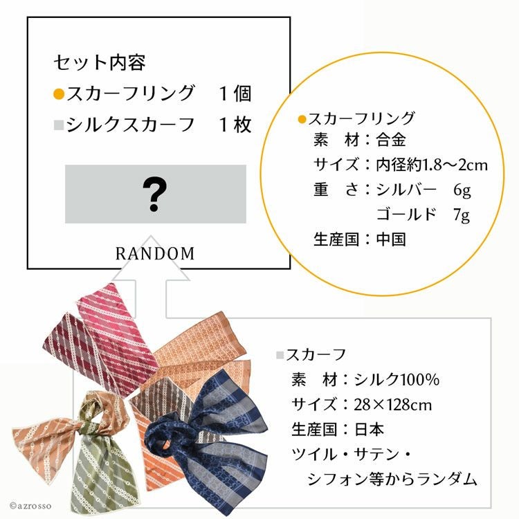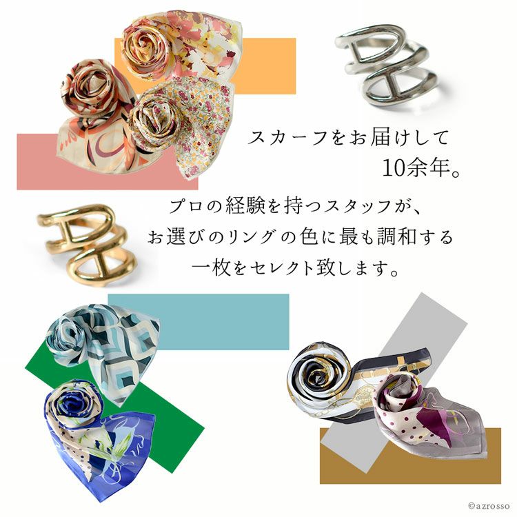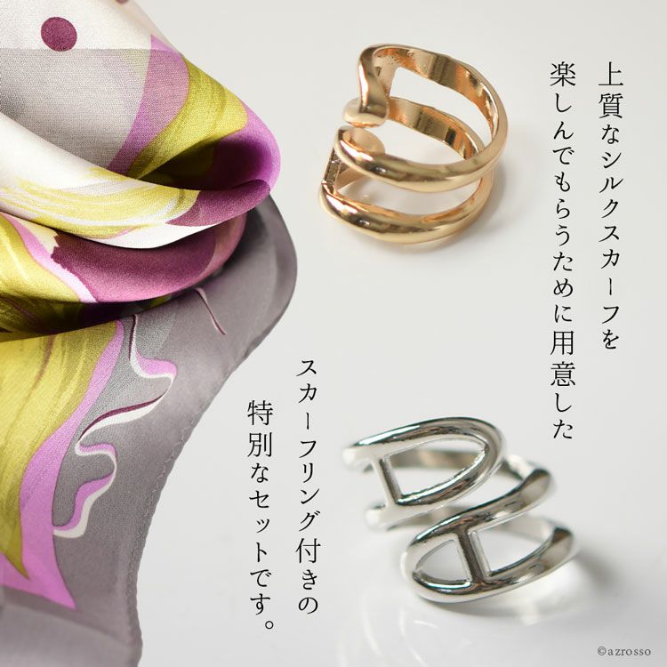 ▼特徴:日本製 シルクスカーフ 長方形 シルク100 横浜スカーフ スカーフリング セット シルバー ゴールド
